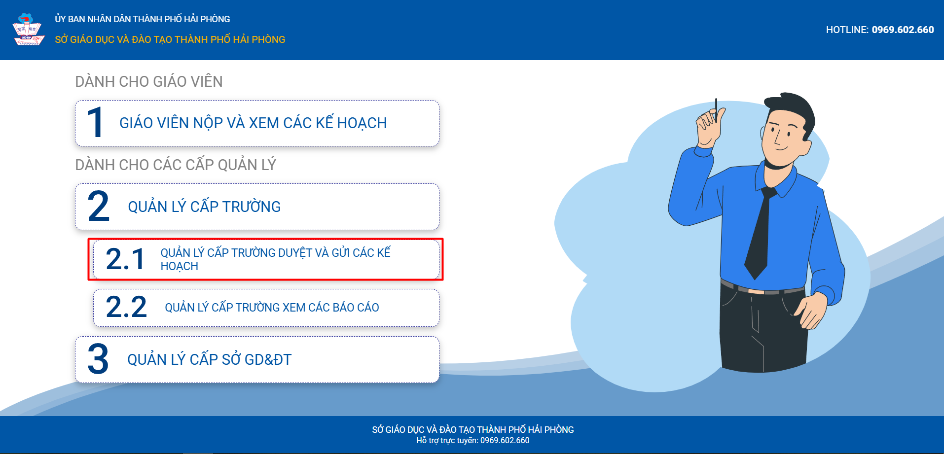 – Tại mục “DÀNH CHO CÁC CẤP QUẢN LÝ”, Thầy/Cô chọn “2.1 QUẢN LÝ CẤP TRƯỜNG DUYỆT VÀ GỬI CÁC KẾ HOẠCH”