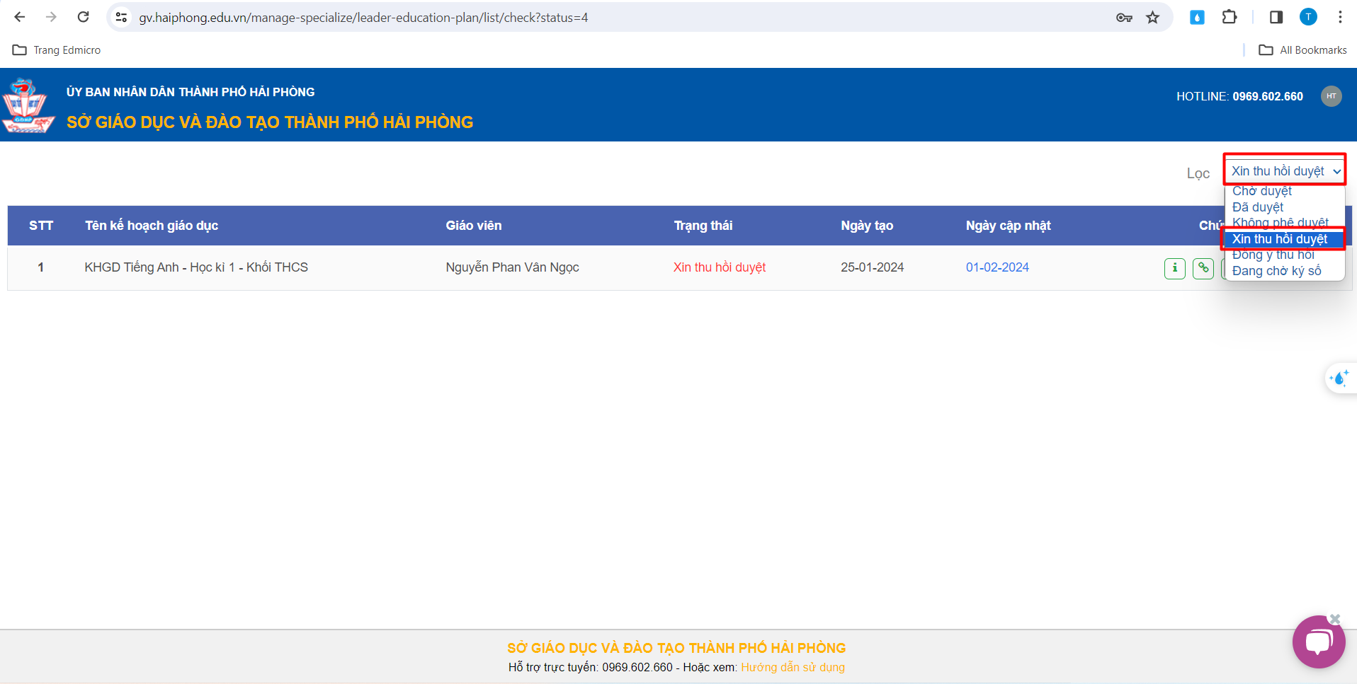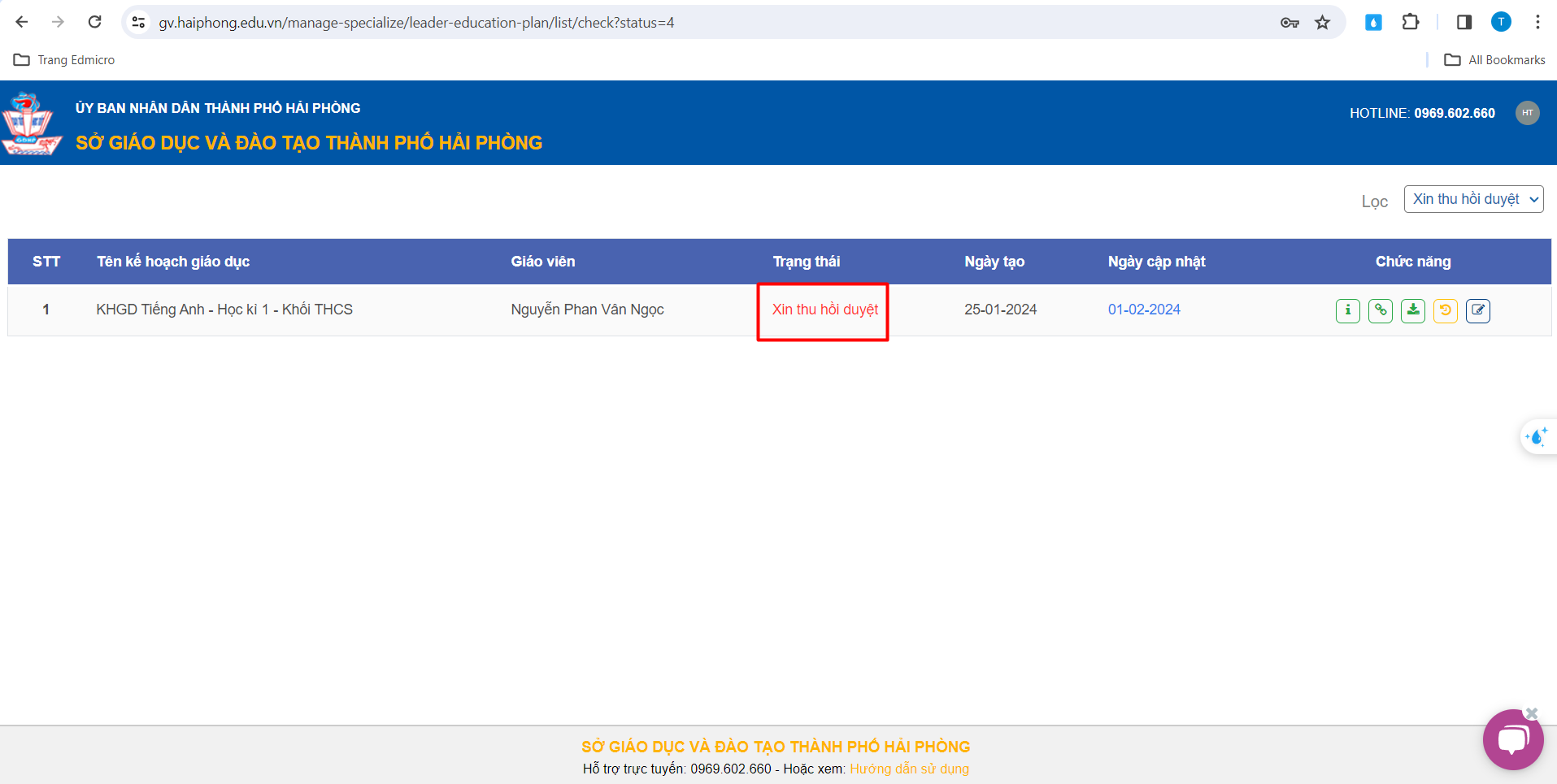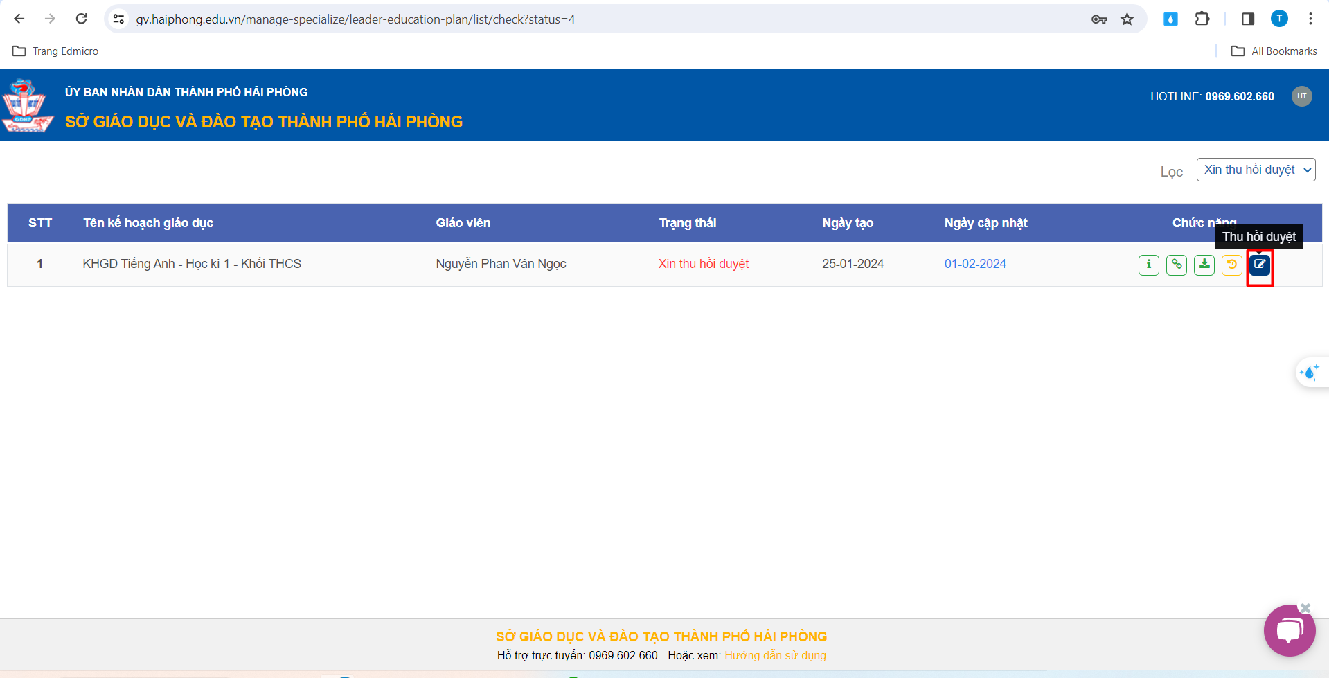 – Tại đây, Thầy/Cô sẽ thấy kế hoạch giáo dục của Tổ chuyên môn xin thu hồi duyệt.