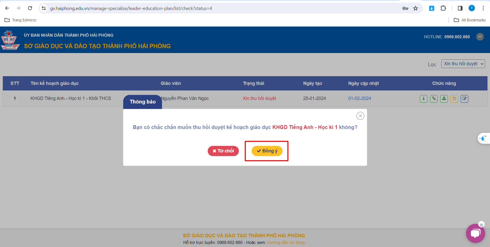 Bước 2: Đồng ý thu hồi Kế hoạch giáo dục của Tổ chuyên môn: