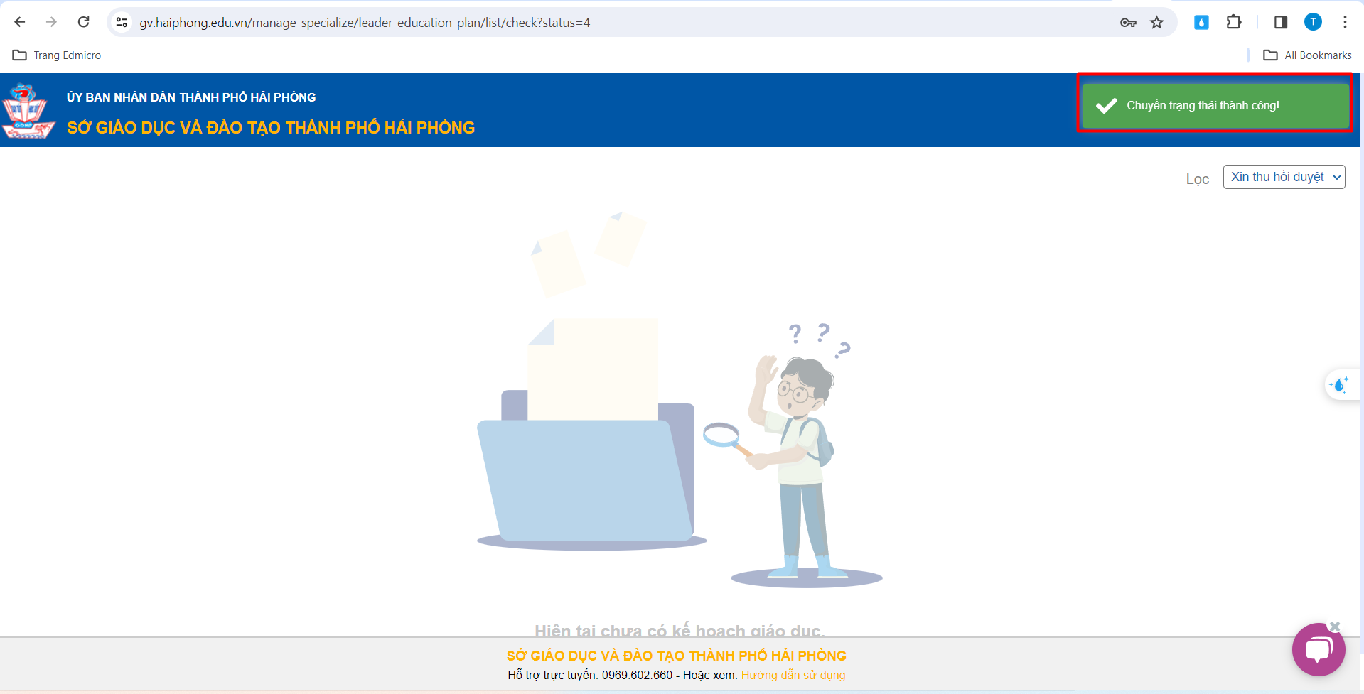 – Sau khi xác nhận thu hồi duyệt KHGD của Tổ chuyên môn, hệ thống sẽ thông báo “Chuyển trạng thái thành công!”