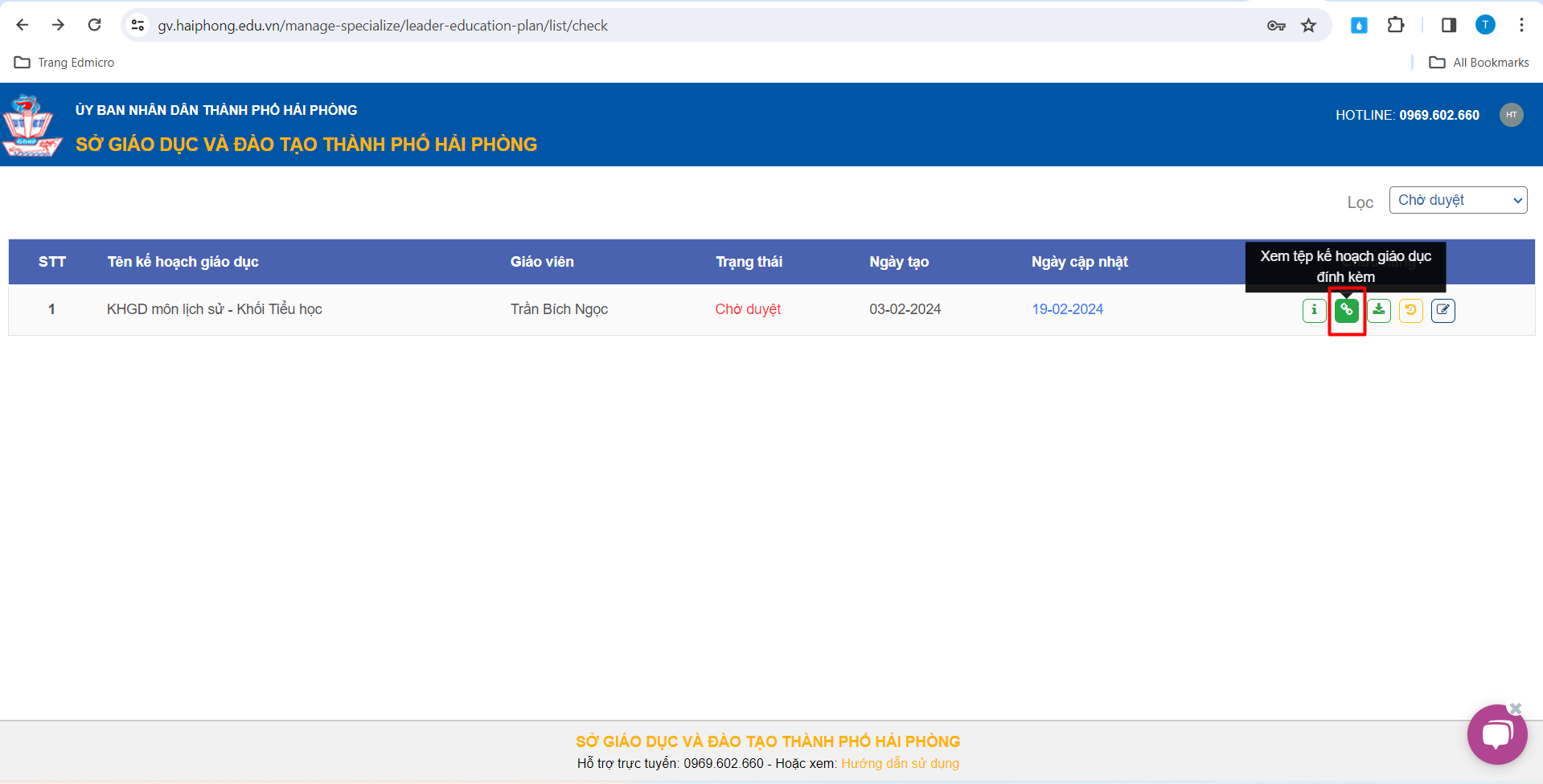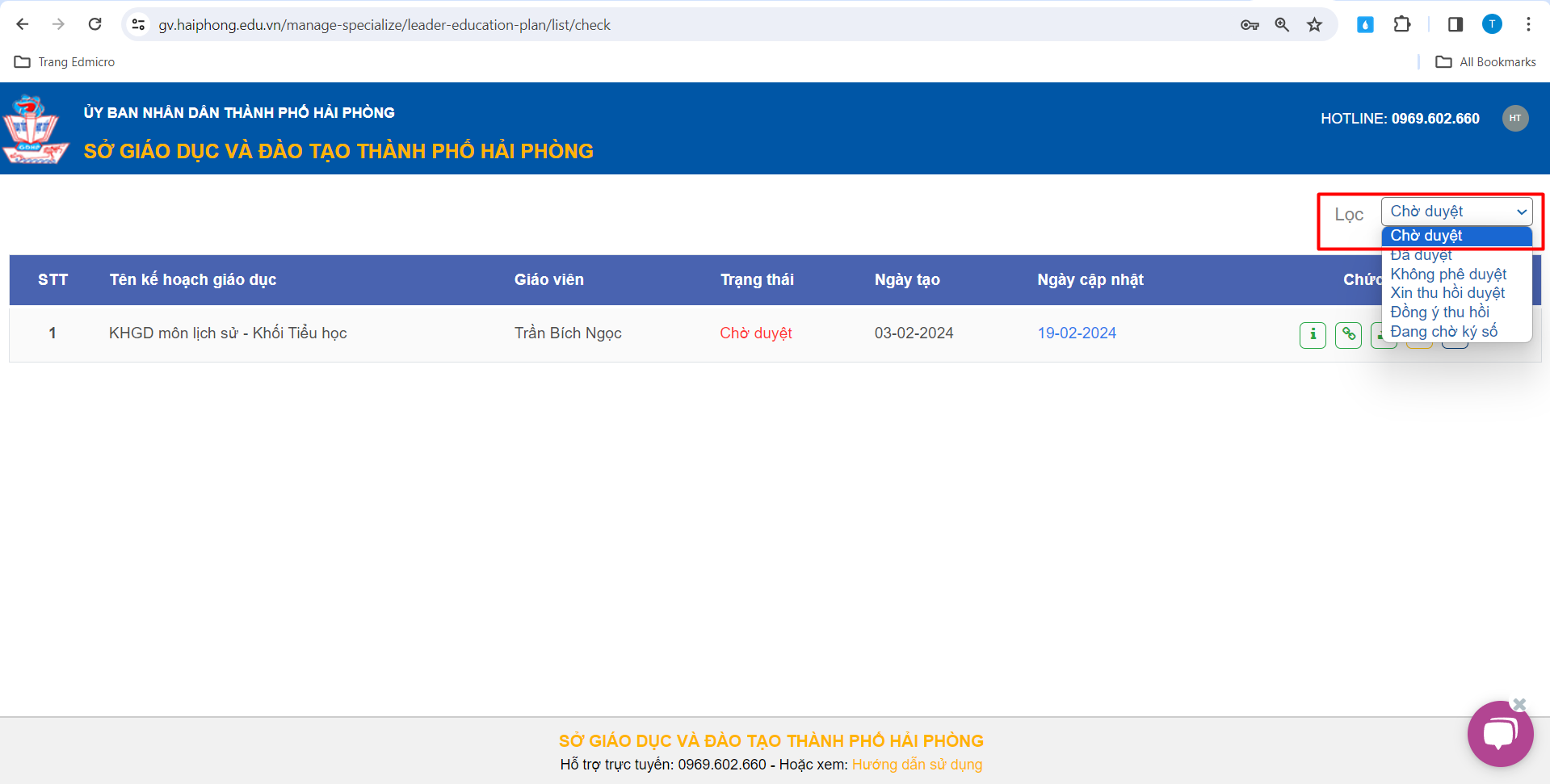 – Thầy/Cô sử dụng tính năng “Lọc” để lọc các Kế hoạch giáo dục đang ở trạng thái chờ duyệt