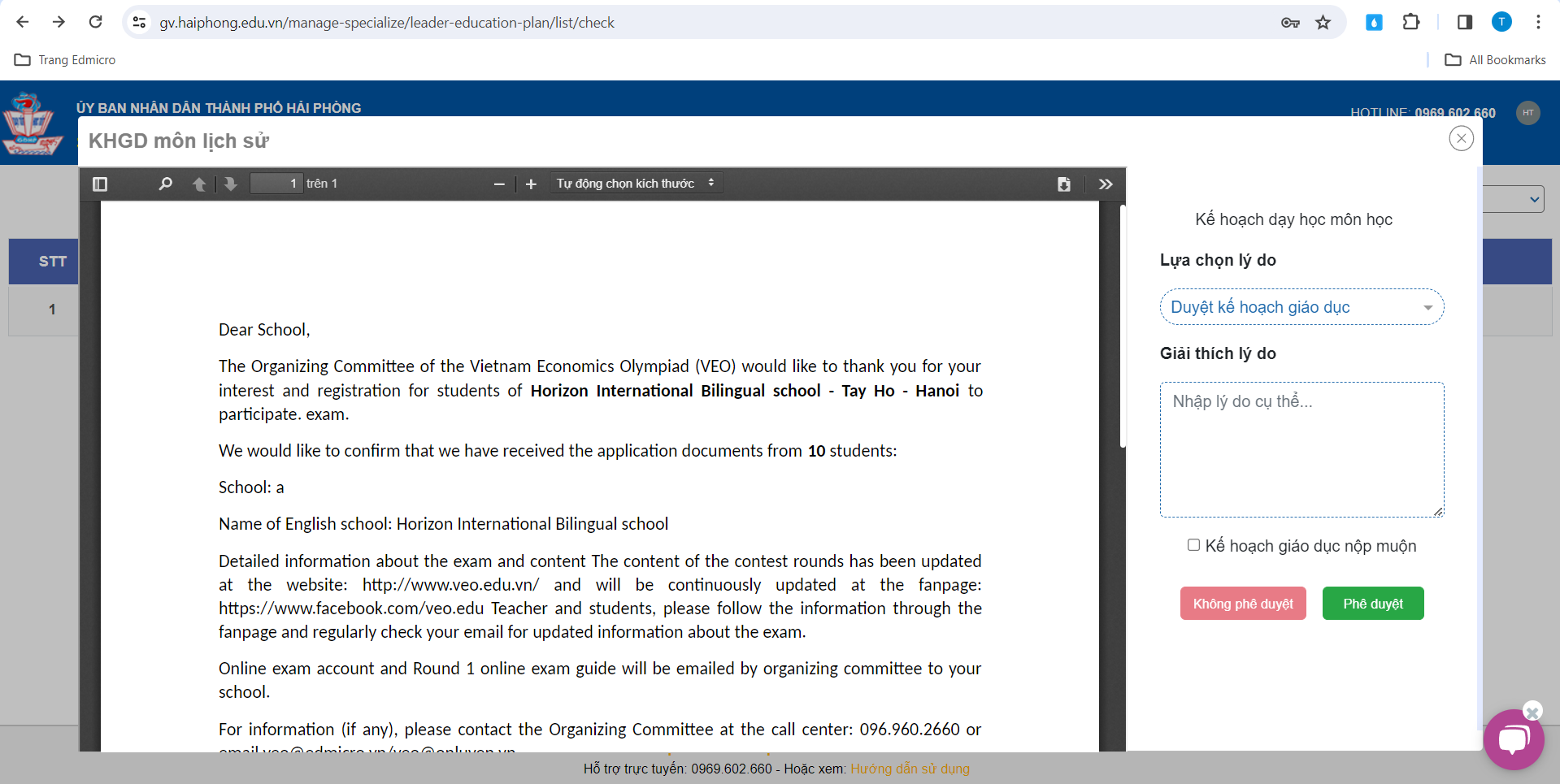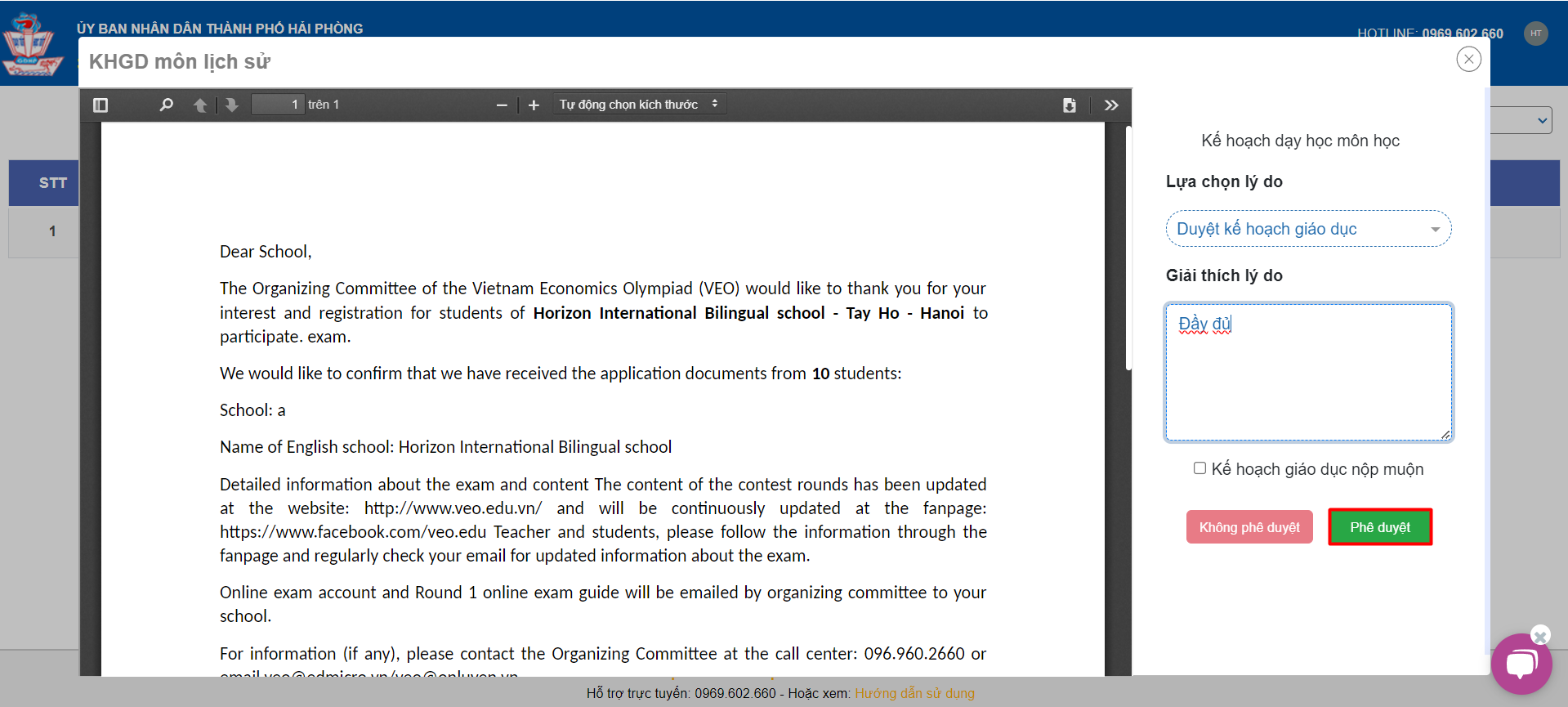 Sau khi lựa chọn lý do, Thầy/Cô chọn “Phê duyệt” để phê duyệt Kế hoạch giáo dục của Tổ bộ môn