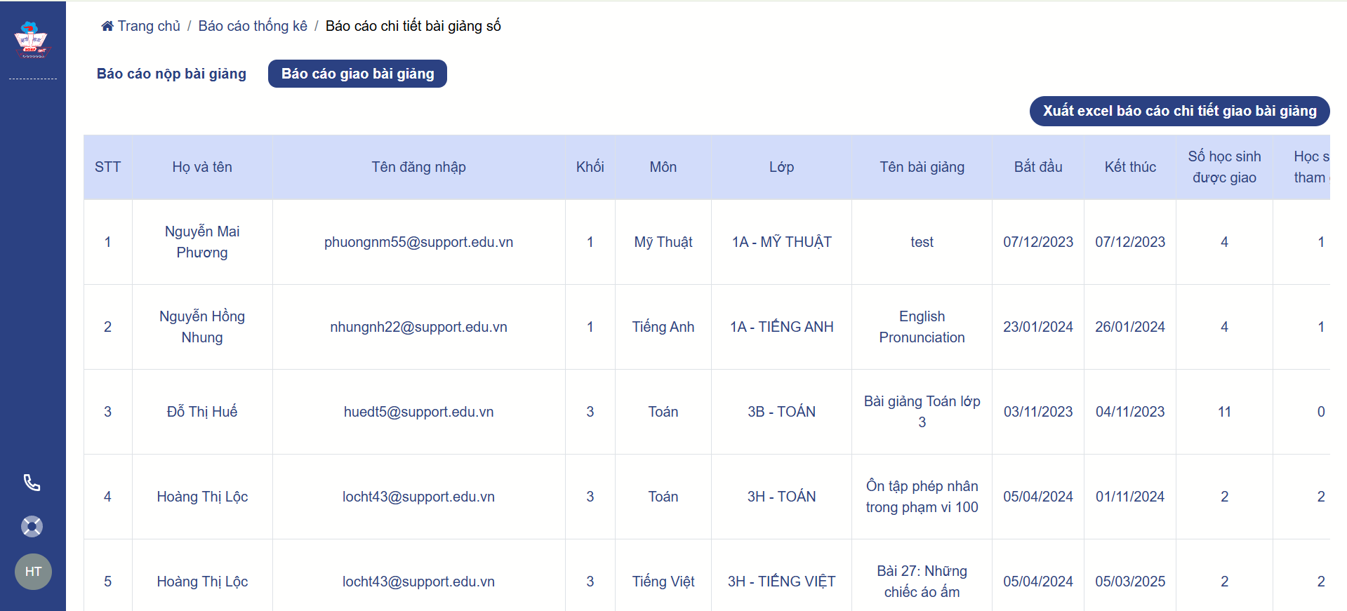 Thầy/cô xem chi tiết báo cáo giáo viên giao bài giảng nào, và tỉ lệ học sinh tham gia học tập