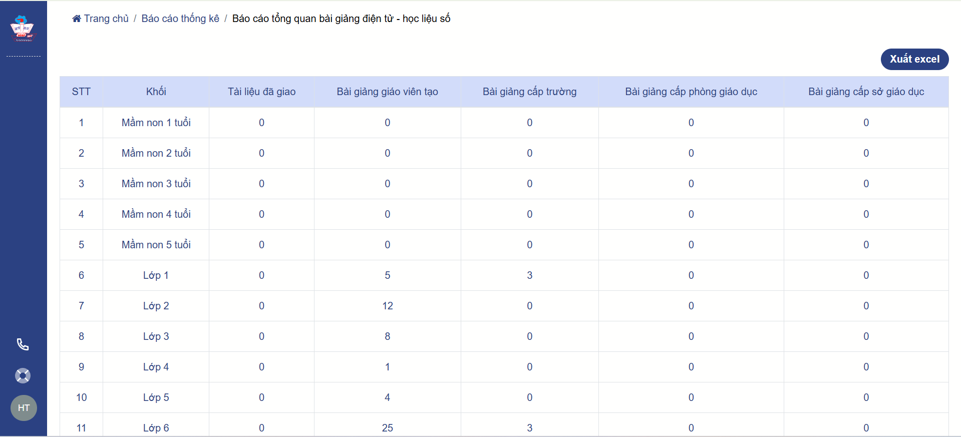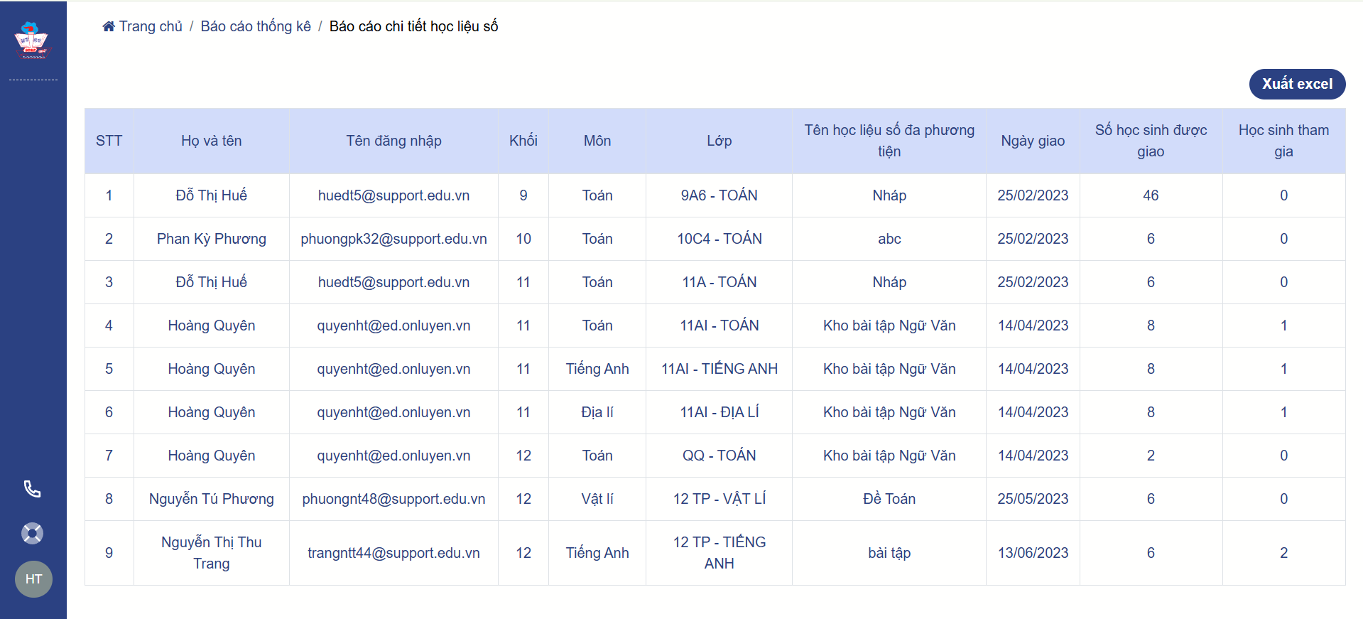Thầy/cô có thể xem báo cáo trực tiếp từ hệ thống hoặc xuất báo cáo và xem dưới dạng file excel.