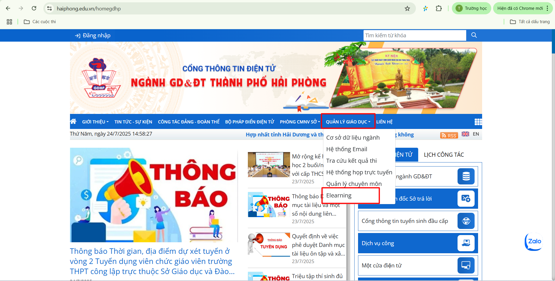 Thầy/cô truy cập tại trang haiphong.edu.vn chọn “Quản lý giáo dục” chọn “Elearning”