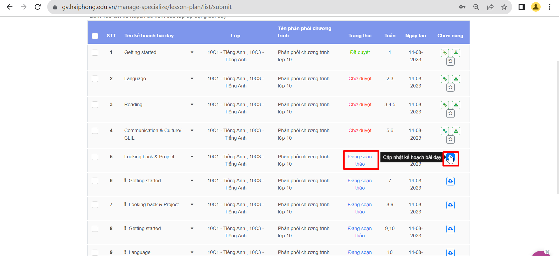 Thầy cô chọn biểu tượng đám mây “Cập nhật Kế hoạch bài dạy”