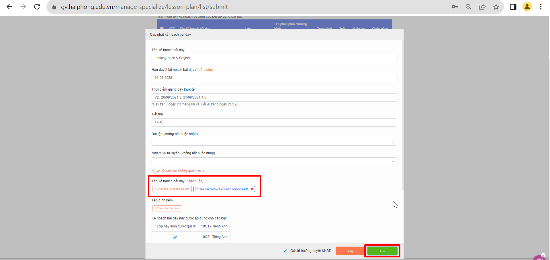 Thầy/cô điền thông tin của kế hoạch bài dạy và đính kèm “Tệp kế hoạch bài dạy” lên hệ thống sau đó chọn: “Lưu”