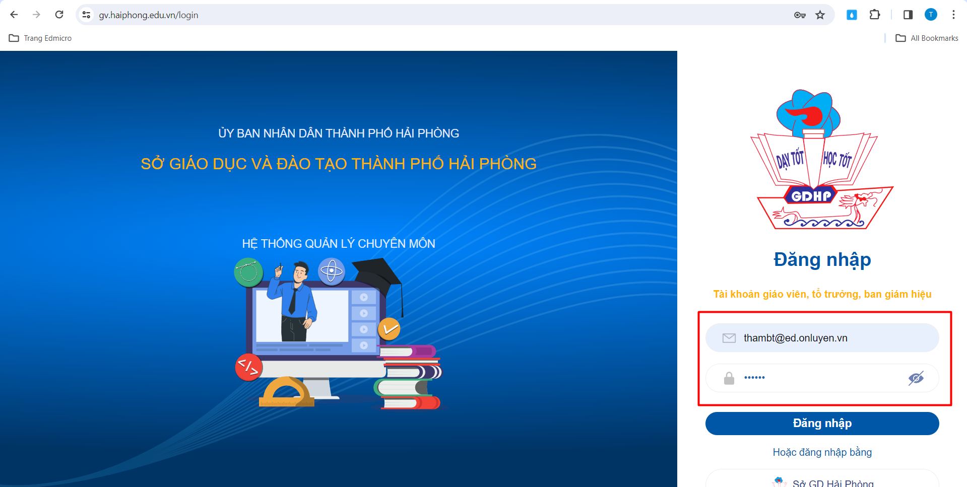 Thầy/Cô sử dụng trình duyệt Google Chrome truy cập vào website “gv.haiphong.edu.vn“.