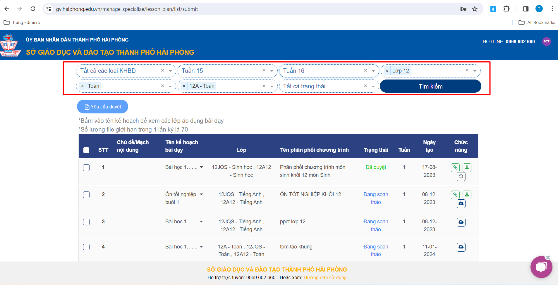– Tại Bộ lọc, thầy/cô lọc các kế hoạch bài dạy theo Tuần, Khối, Môn, Lớp, Trạng thái kế hoạch bài dạy để “Tìm” kế hoạch bài dạy cần nộp.