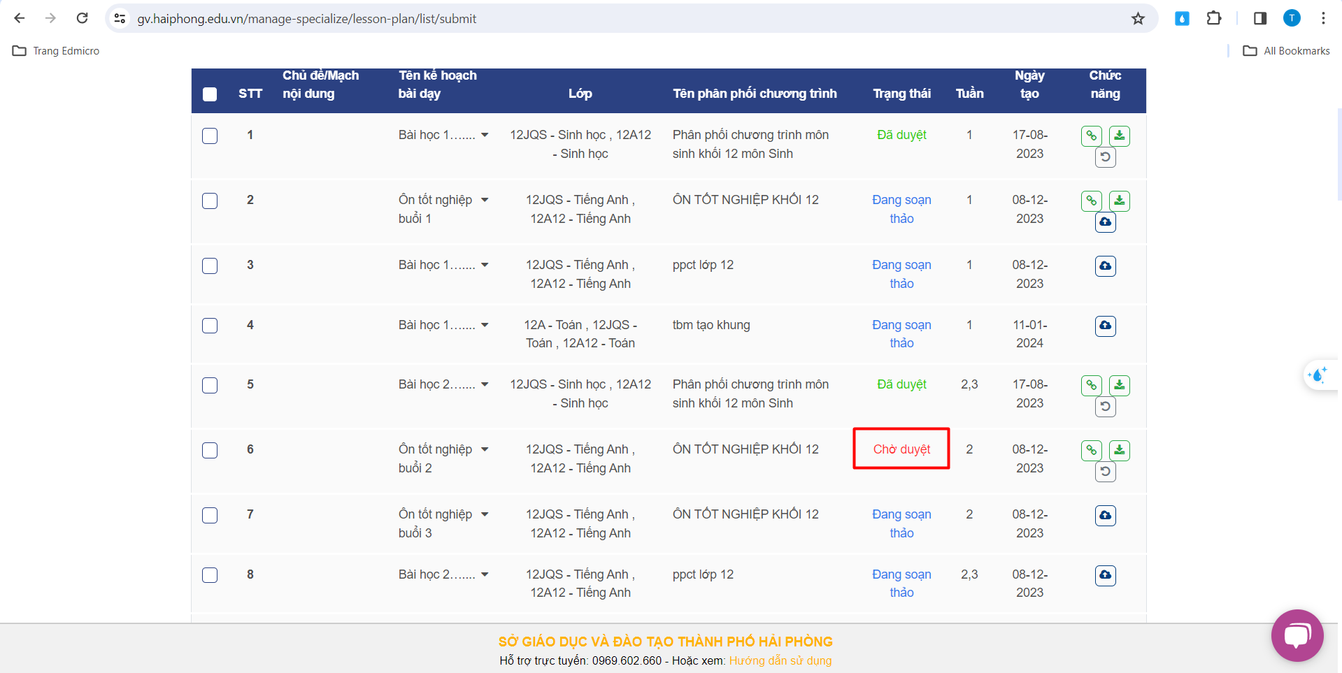 – Hệ thống hiện thông báo chuyển thành công trạng thái của Kế hoạch bài dạy và trạng thái lúc này là “Chờ duyệt”.