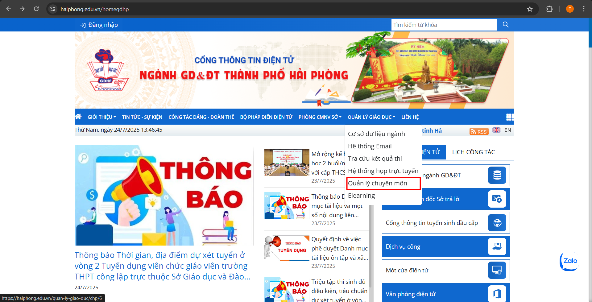 – Tại Cổng thông tin điện tử, Thầy/Cô chọn “Quản lý giáo dục” , chọn “Quản lý chuyên môn“.