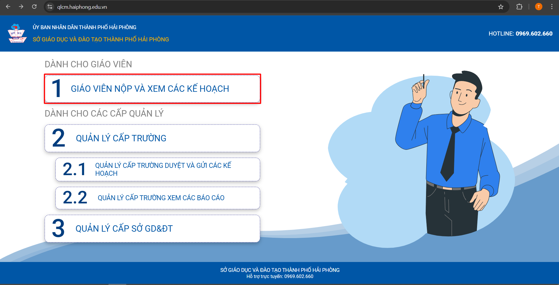 – Tại mục dành cho giáo viên, Thầy/Cô chọn ”1. Giáo viên nộp và xem các kế hoạch”