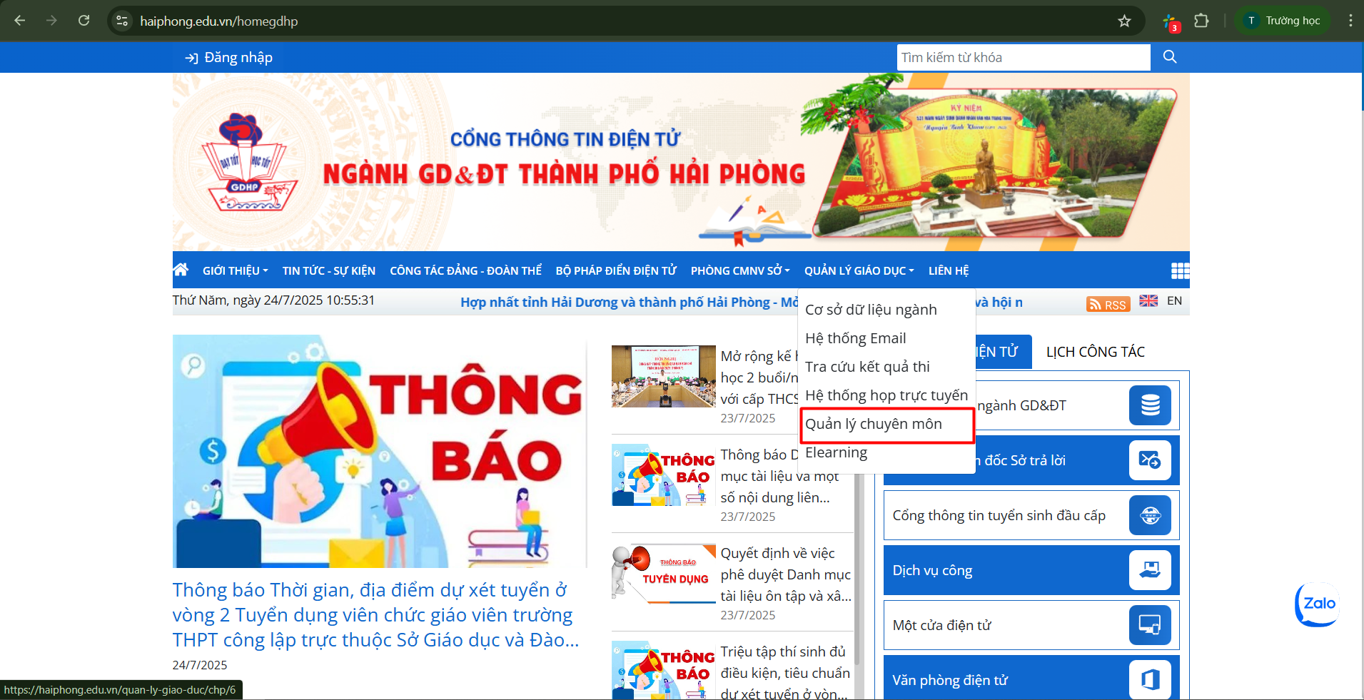 – Tại Cổng thông tin điện tử, Thầy/Cô chọn QUẢN LÝ GIÁO DỤC, chọn QUẢN LÝ CHUYÊN MÔN.