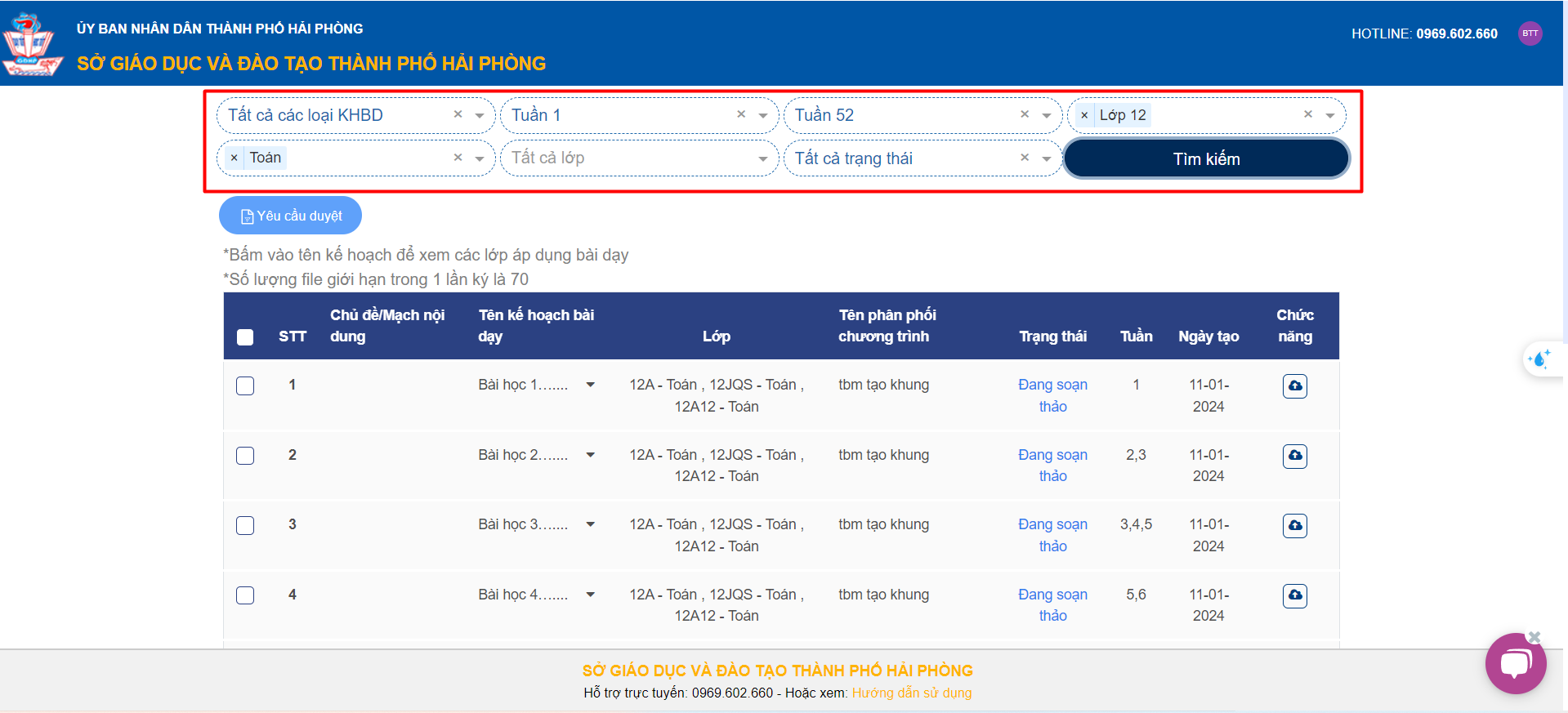 – Thầy/Cô chọn bộ lọc, sau đó tìm kế hoạch bài dạy (Giáo án) cần thu hồi duyệt và chọn “Tìm”.