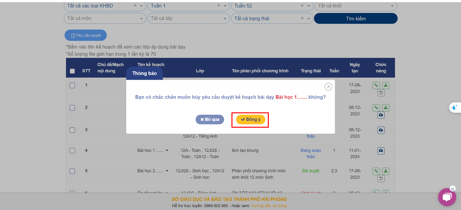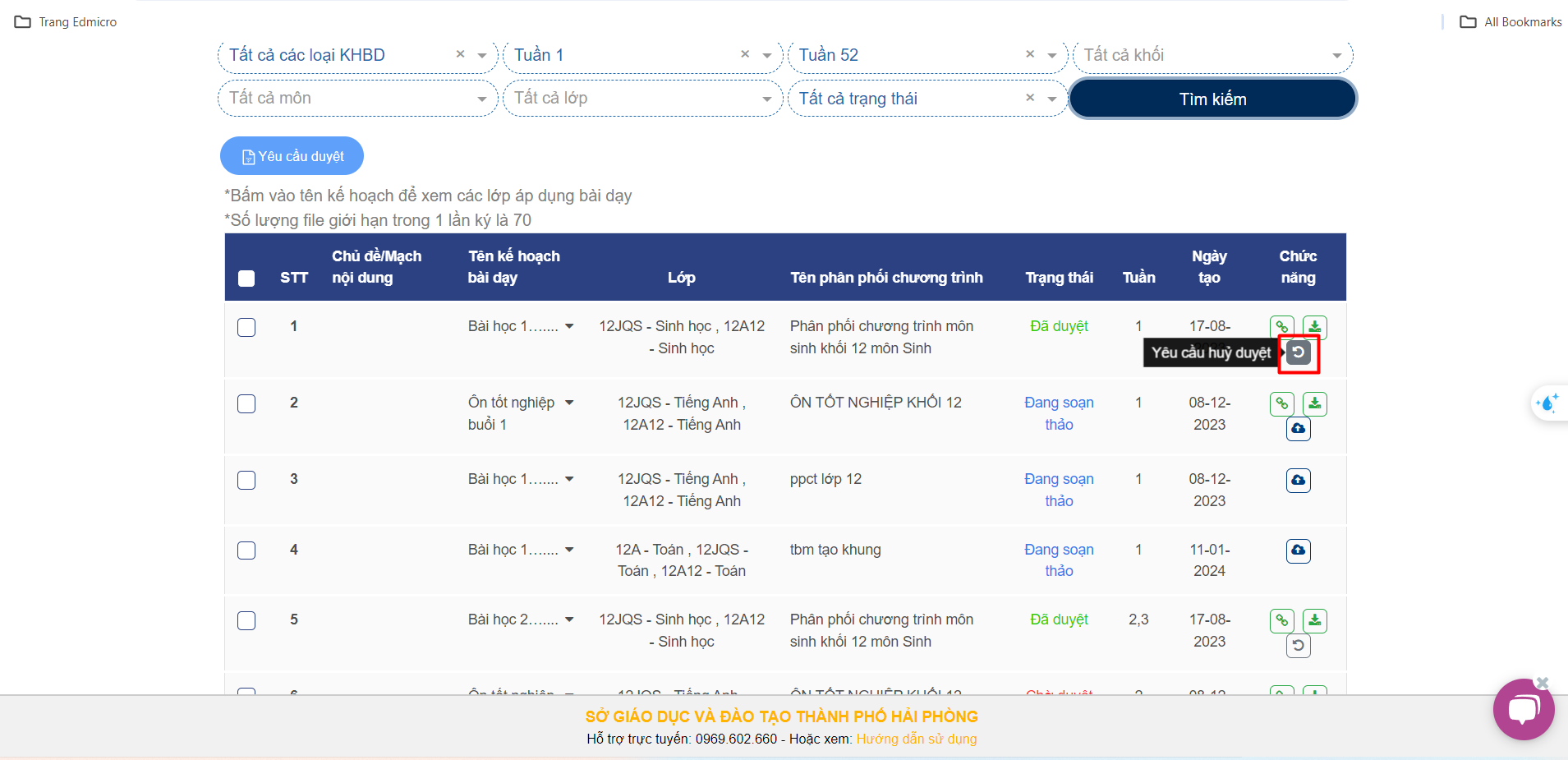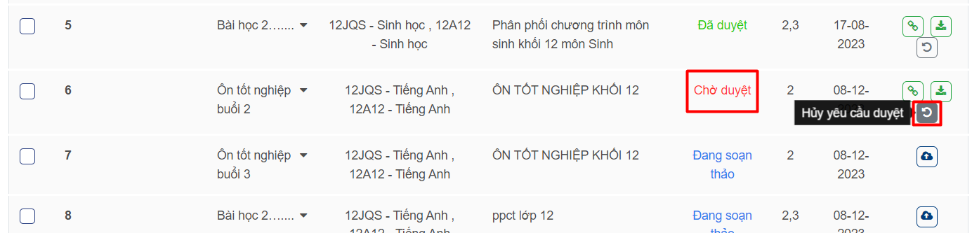 – Đối với kế hoạch bài dạy (Giáo án) đang ở trạng thái “Chờ duyệt”, thầy cô có thể chọn “Hủy yêu cầu duyệt”