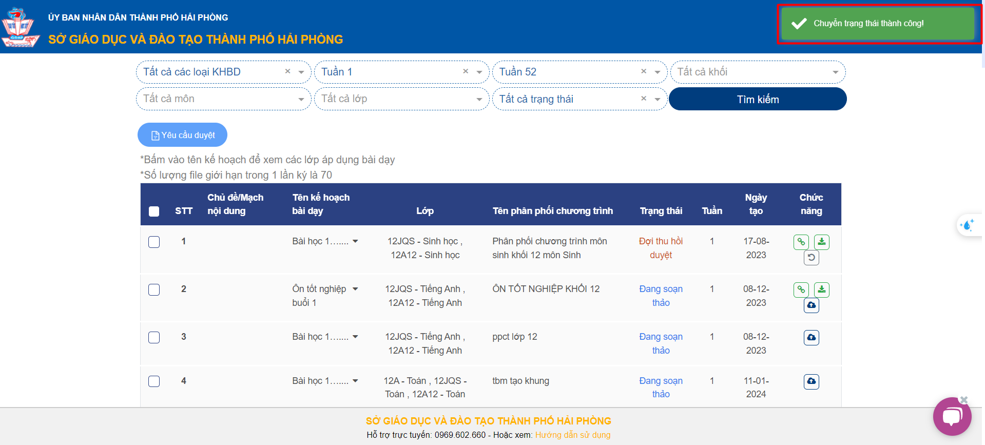 – Sau khi xác nhận xin thu hồi duyệt, hệ thống sẽ thông báo “Chuyển trạng thái thành công!”.