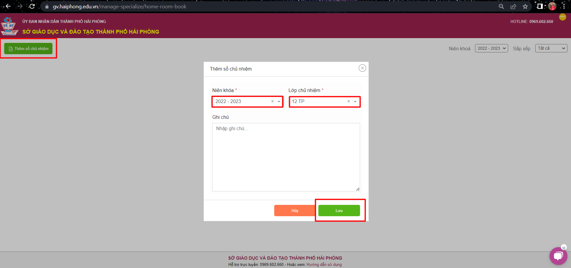 -Tại đây, Thầy/cô chọn “Thêm sổ chủ nhiệm“, nhập thông tin “niên khóa“, “lớp chủ nhiệm” và ” ghi chú“(nếu có). Chọn ” Lưu“.