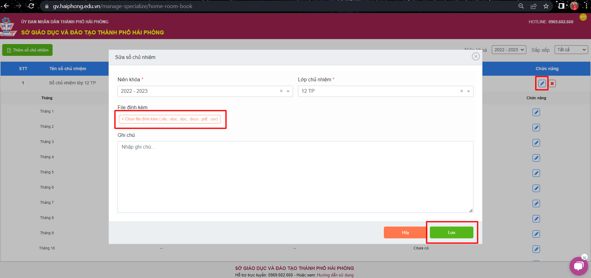 -Thầy/cô chọn biểu tượng ” Sửa sổ chủ nhiệm” trên cột chức năng và tải lên file đính kèm. Chọn “Lưu“.