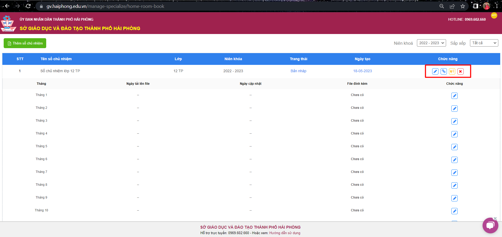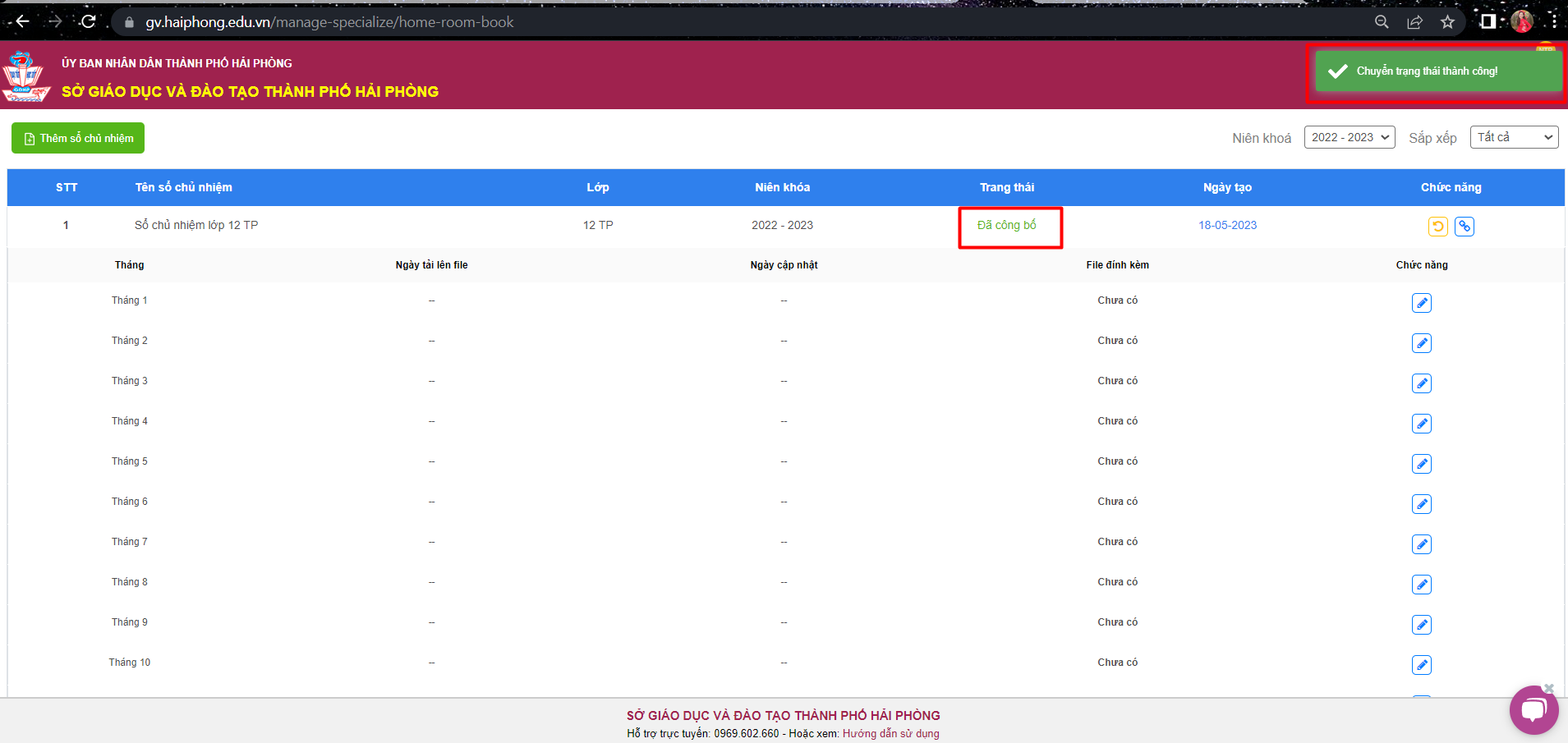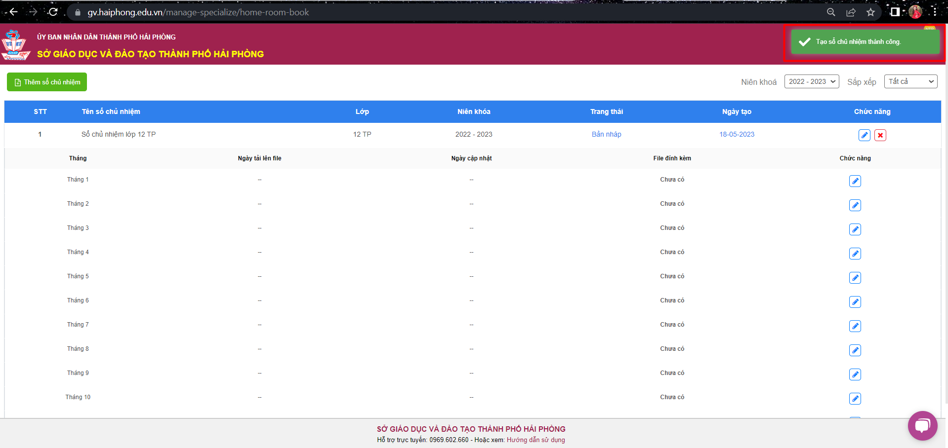 -Hệ thống thông báo ” Tạo sổ chủ nhiệm thành công“.