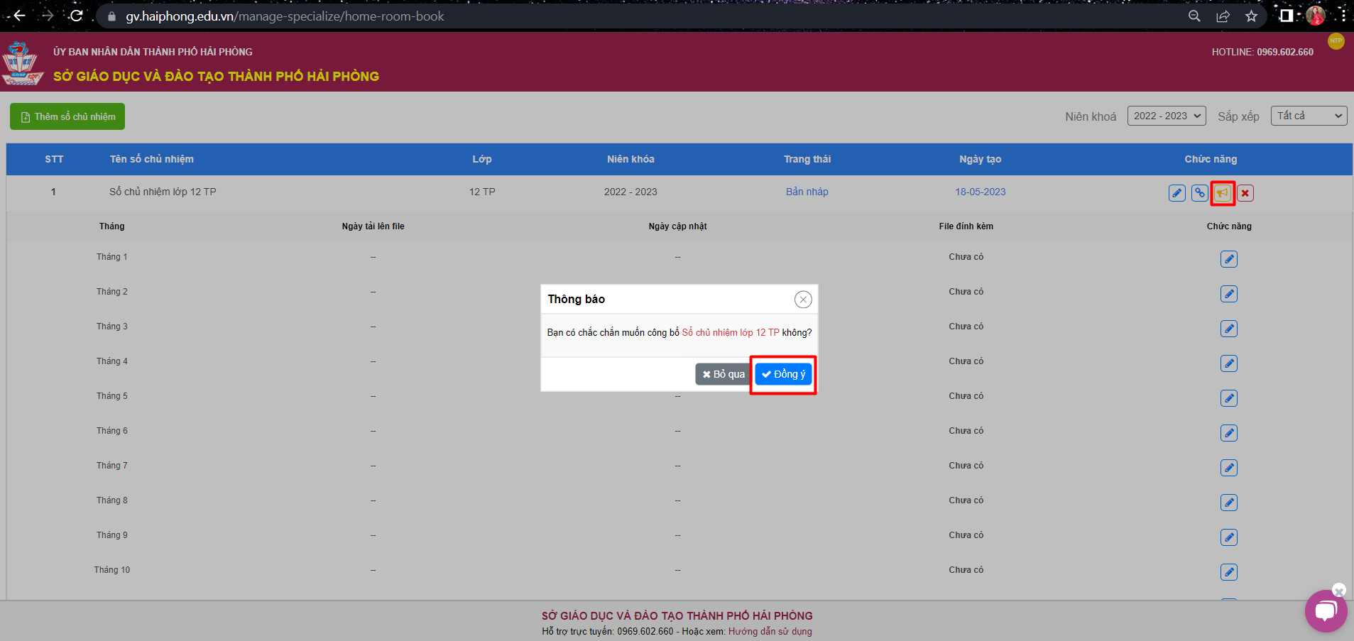 -Thầy/cô tích chọn biểu tượng ” công bố“, xác nhận ” đồng ý” để công bố Hồ sơ chủ nhiệm.