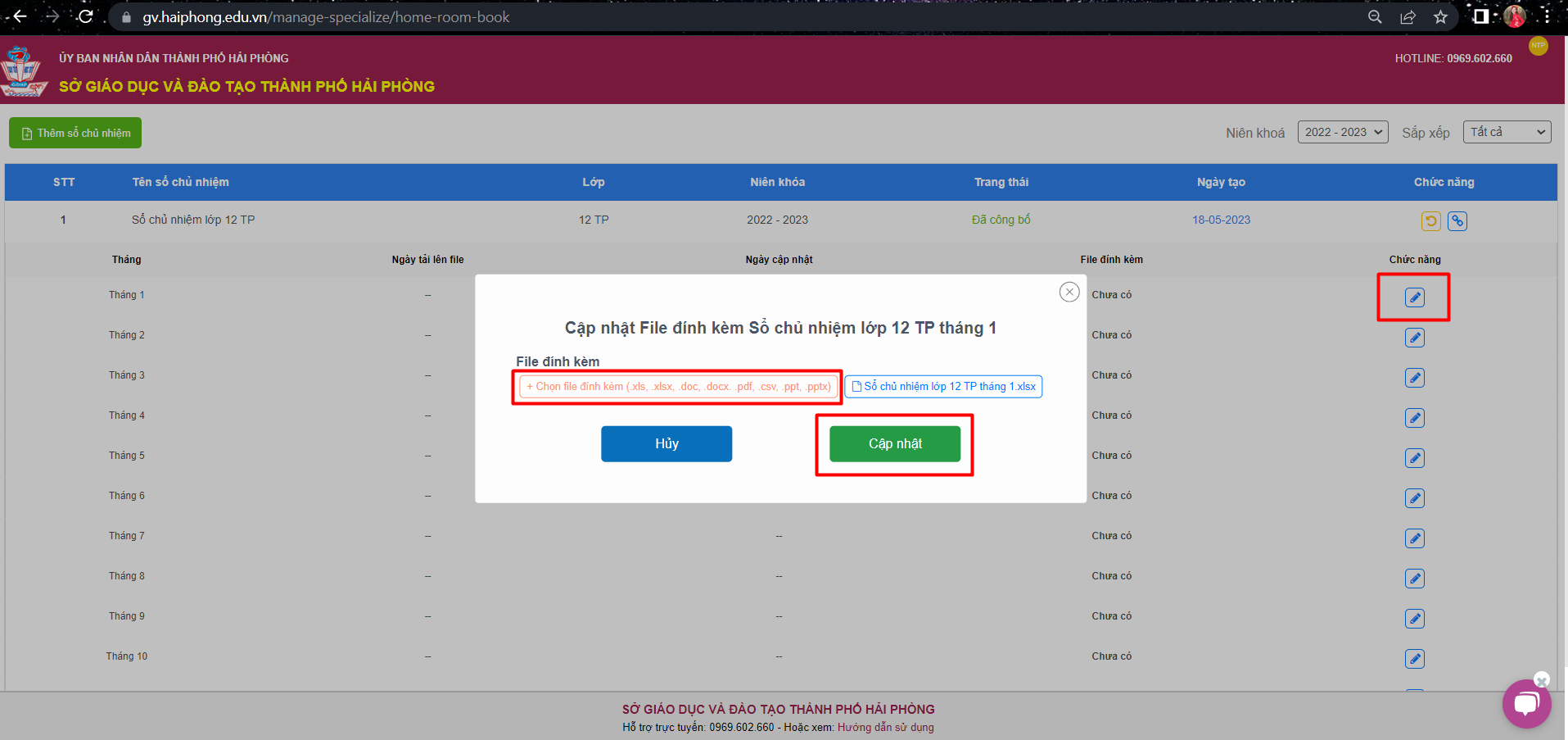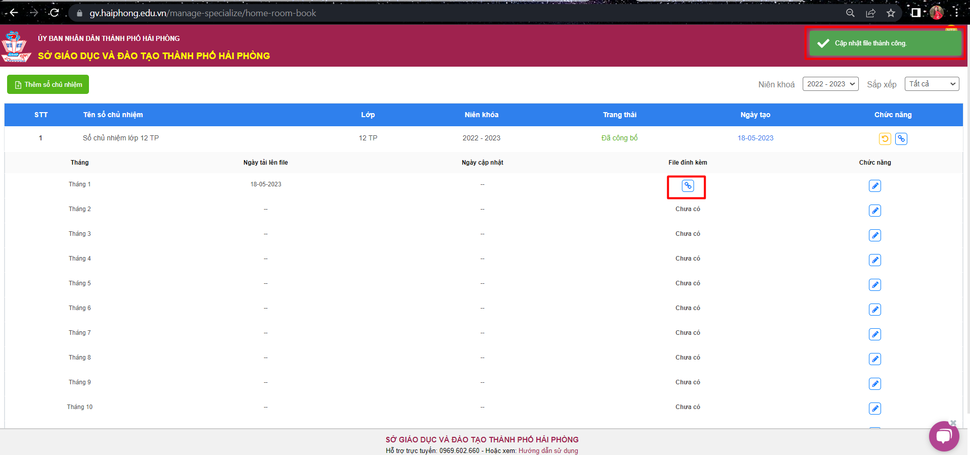 -Tại đây, mỗi lớp chủ nhiệm sẽ phải thêm file sổ hàng tháng.Thầy/cô tích chọn biểu tượng tại cột ” chức năng” để cập nhật file đính kèm của mỗi tháng, chọn ” tải lên file đính kèm”, chọn “cập nhật“.