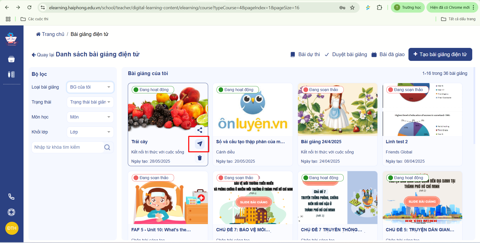 Thầy/cô chọn biểu tượng “chia sẻ”, chọn “Giao bài giảng điện tử”
