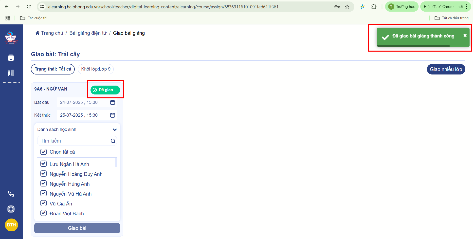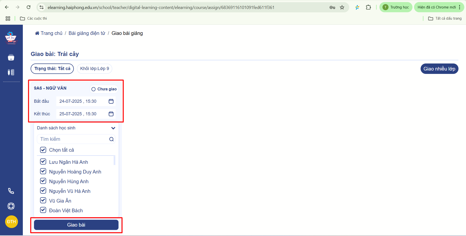 Thầy/cô chọn lớp giao bài, điều chỉnh thời gian bắt đầu và thời gian kết thúc giao bài, sau đó chọn “Giao bài” cho học sinh