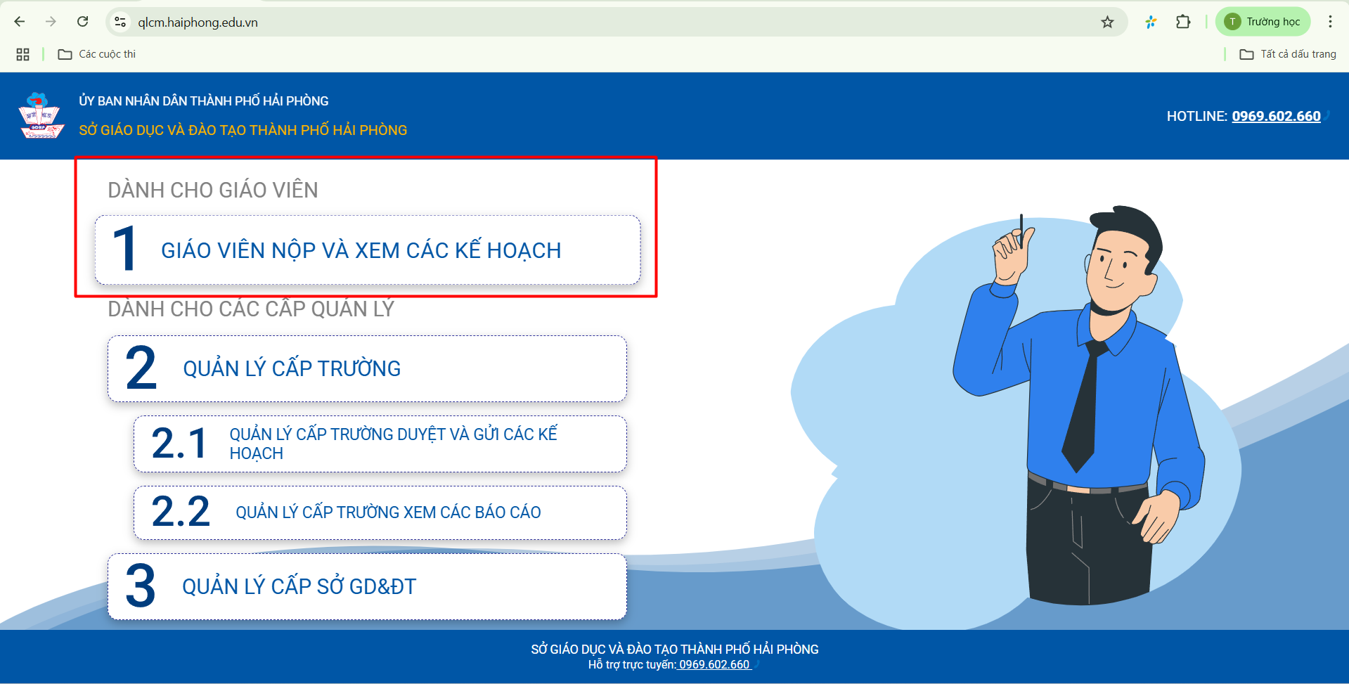 – Tại mục “Dành cho Giáo viên” Thầy/ Cô chọn “1 Giáo viên nộp và xem các kế hoạch”.