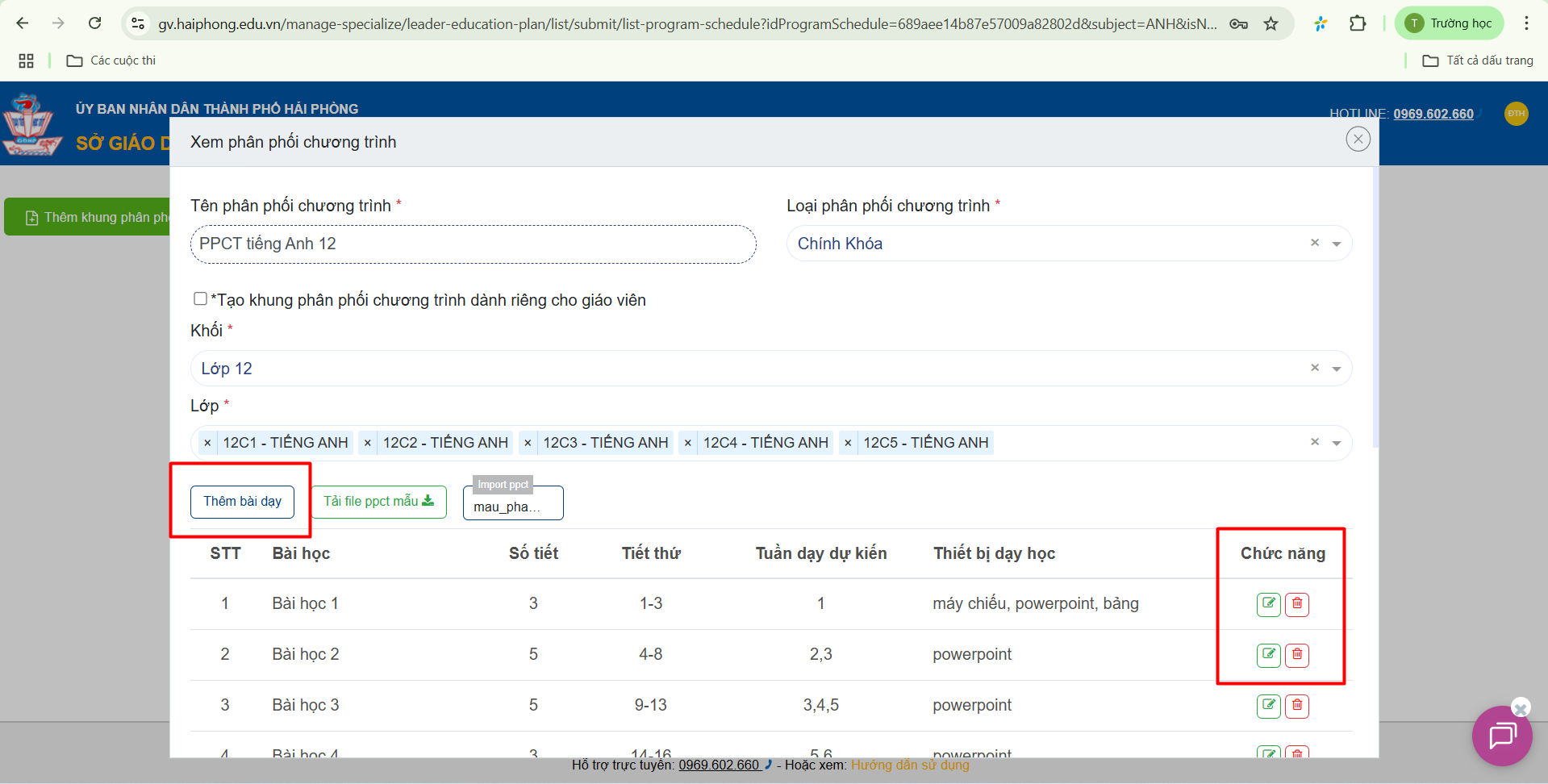 – Thầy/cô có thể “Thêm bài dạy”, “chỉnh sửa” hoặc “xóa” bằng cách tích vào các biểu tượng