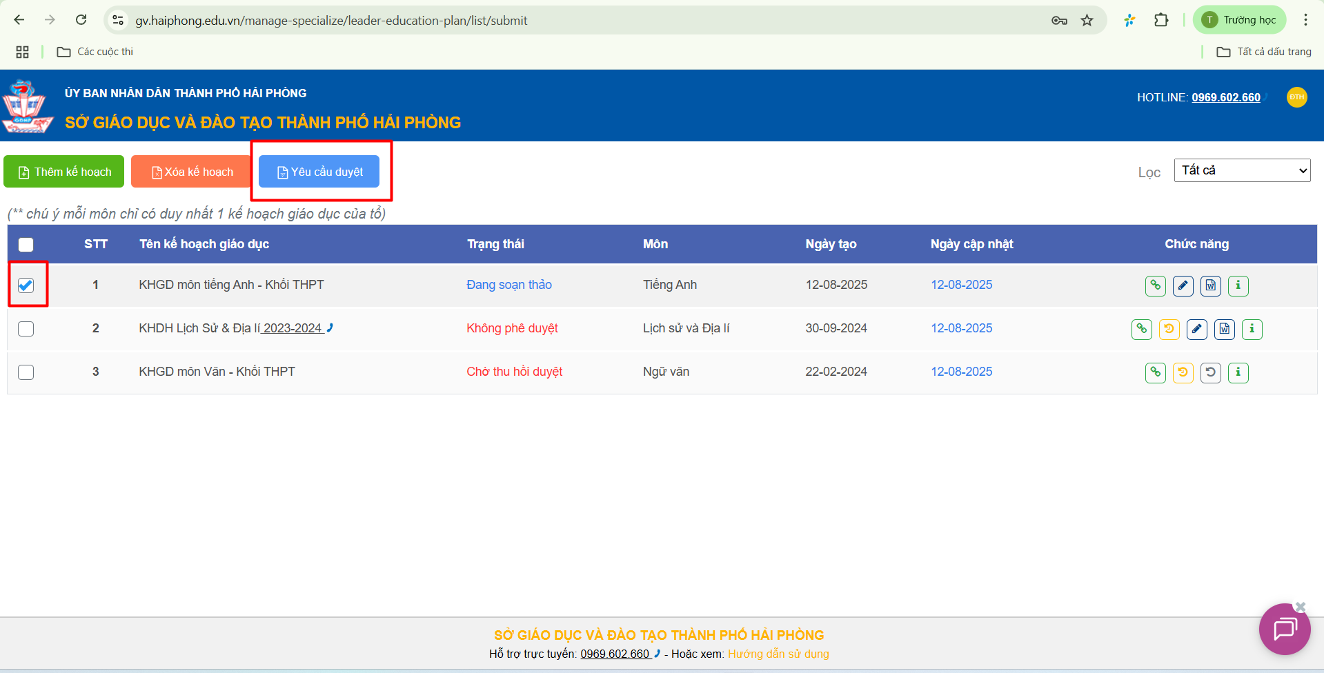-Thầy/cô tích chọn KHGD muốn nộp, chọn “Yêu cầu duyệt”.