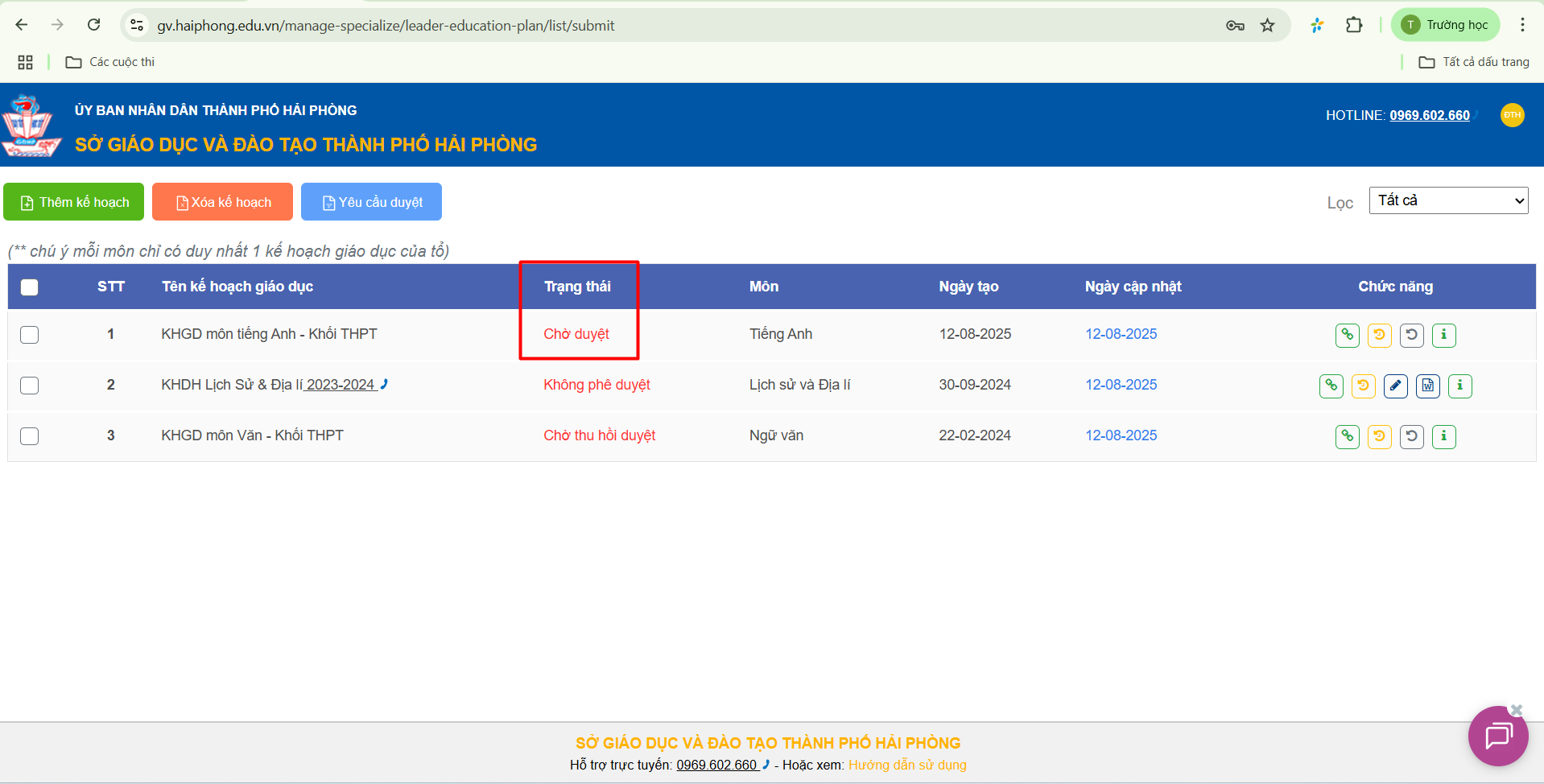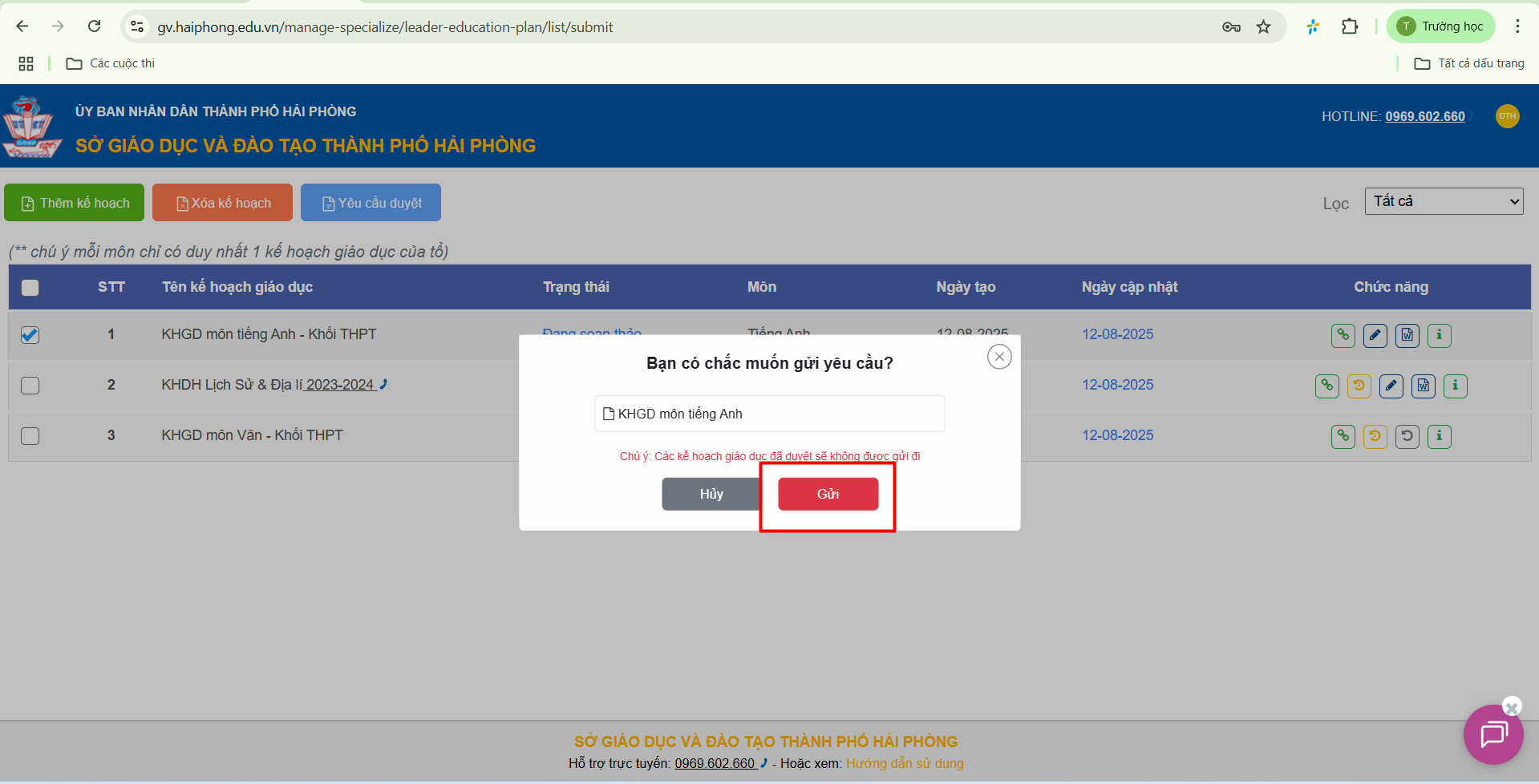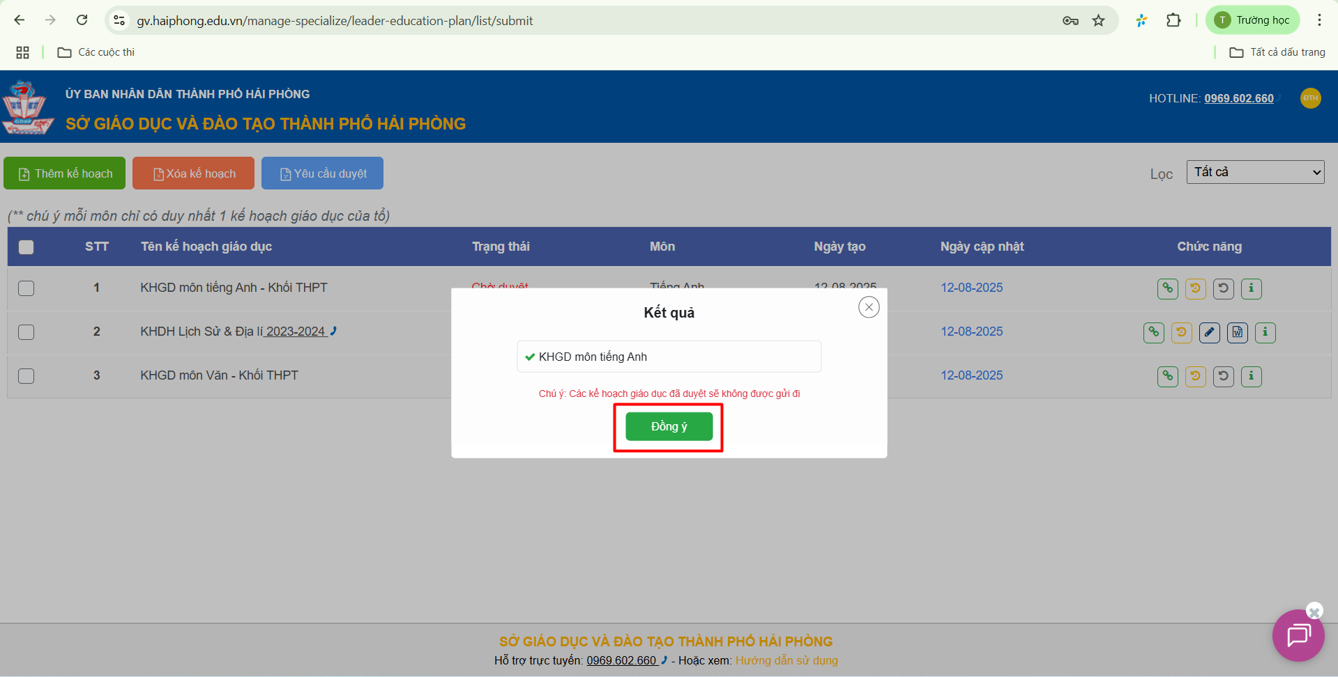 – Thầy/cô chọn “Đồng ý” để xác nhận gửi yêu cầu duyệt Kế hoạch giáo dục.