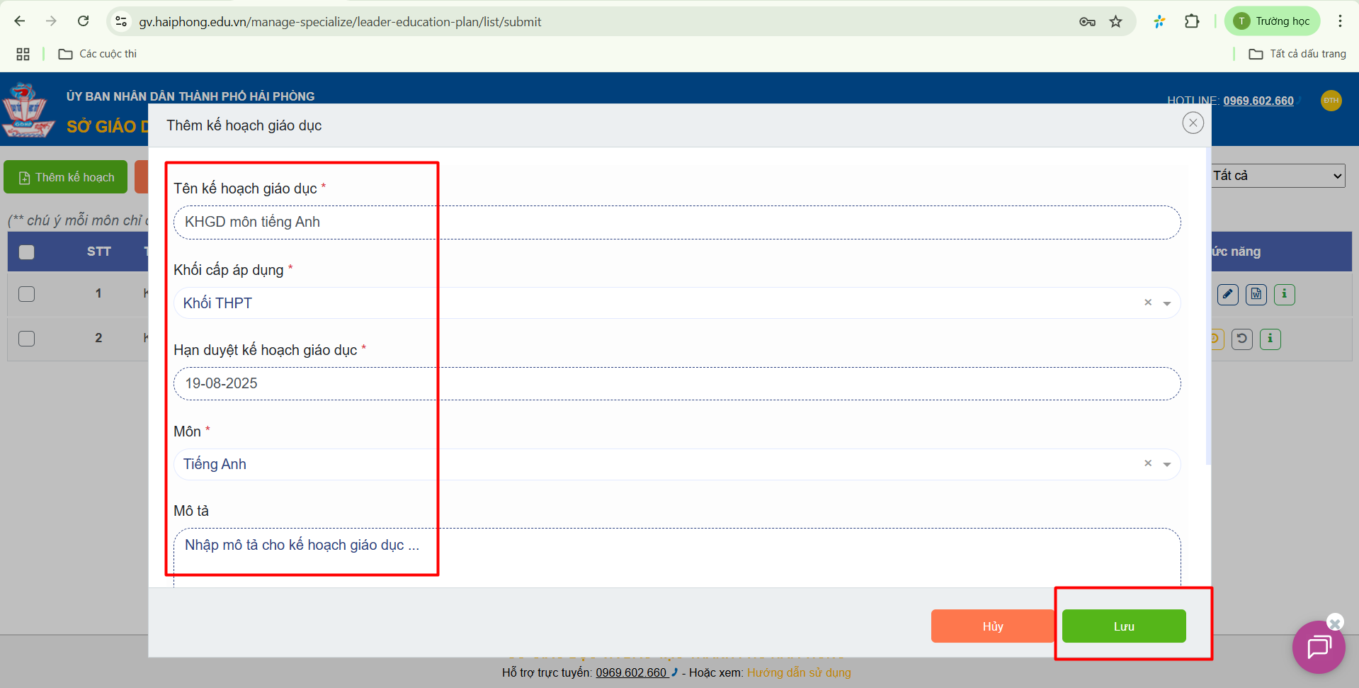 Thầy/cô nhập thông tin kế hoạch bài dạy, chọn “Lưu” để cập nhật kế hoạch.