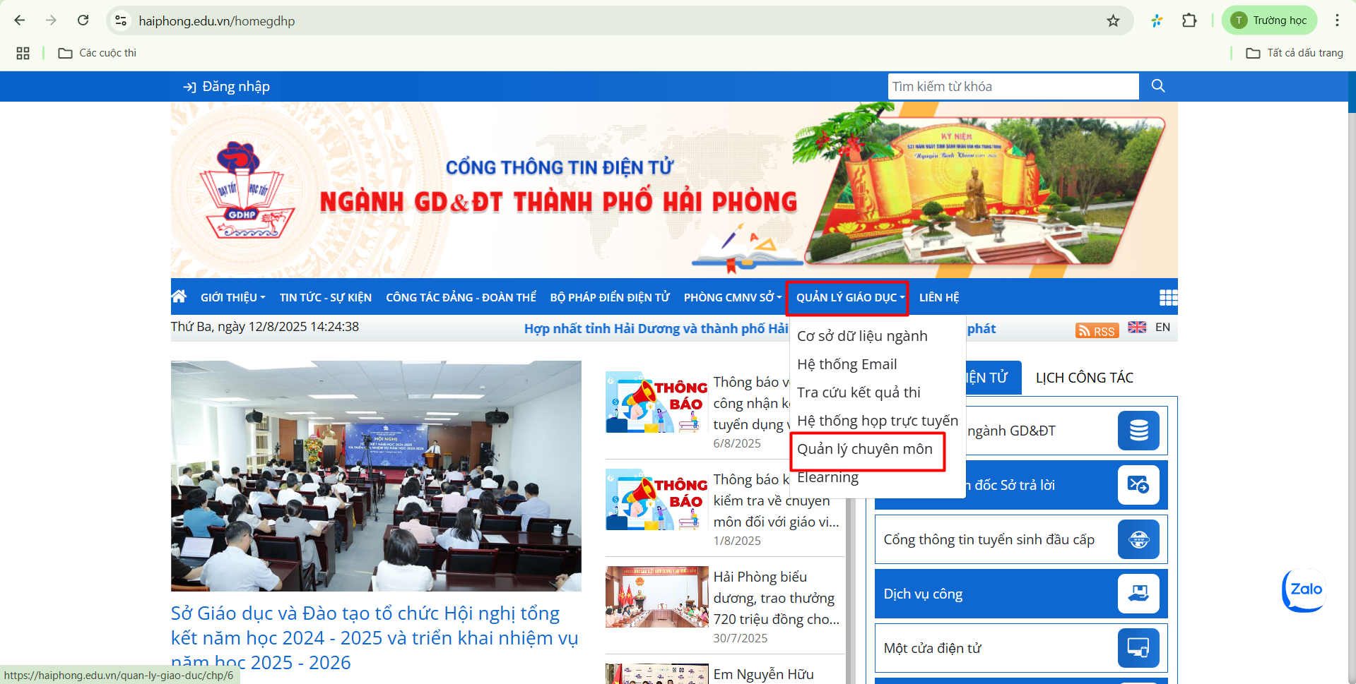 – Tại Cổng thông tin điện tử, Thầy/Cô chọn “Quản lý giáo dục” , chọn “Quản lý chuyên môn”.