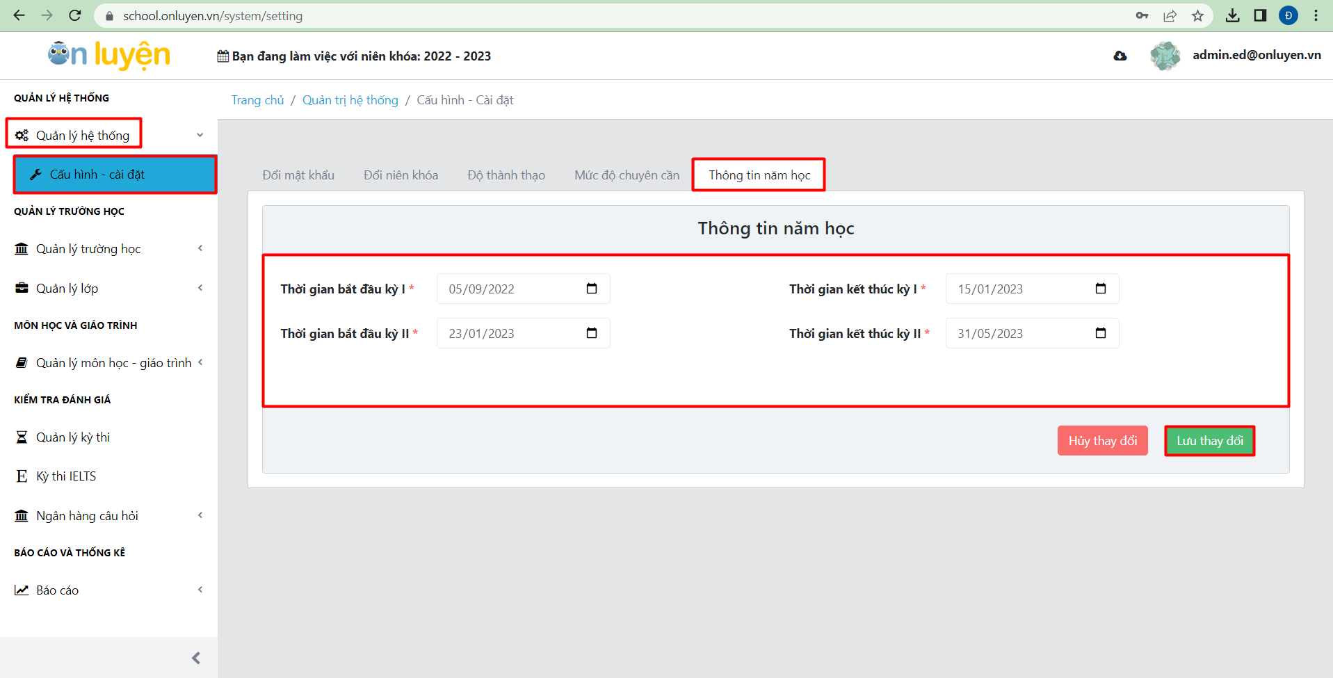 2. Tại mục “Quản lý hệ thống”, thầy cô chọn “Cấu hình cài đặt” và “Thông tin năm học”, thầy cô cập nhật thời gian học kỳ I và học Kỳ II theo theo thời gian hoạt động giảng dạy thực tế của nhà trường và chọn “Lưu thay đổi”.