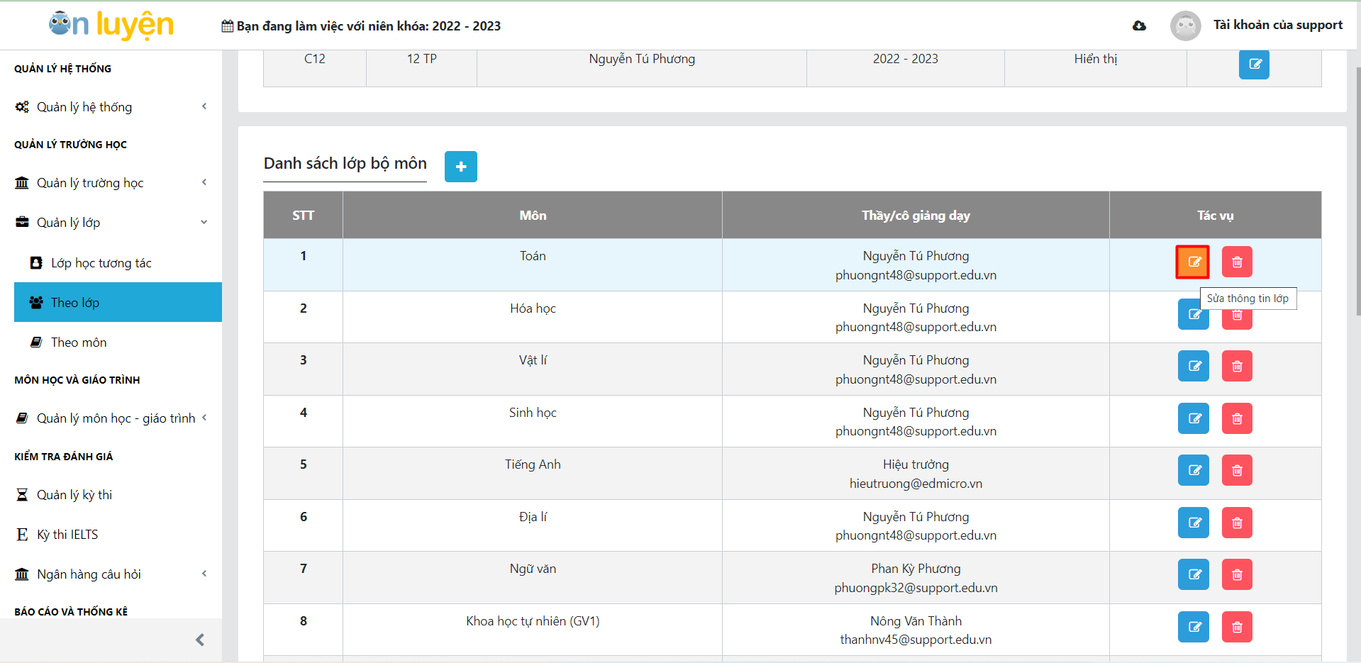 4. Tại các lớp bộ môn, thầy cô chọn mục “Sửa thông tin lớp”