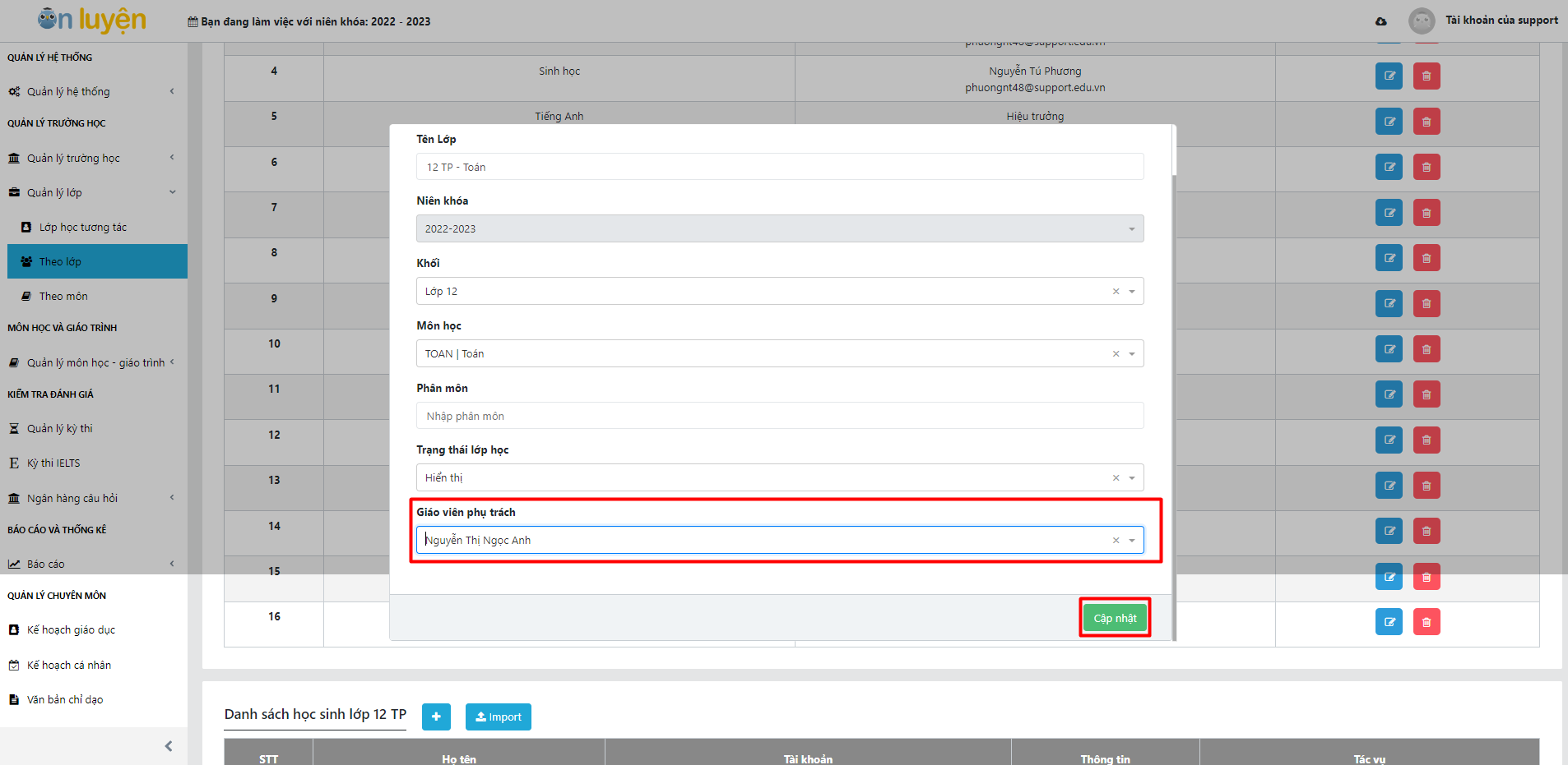 5. Thầy cô thay đổi mục “Giáo viên phụ trách” và chọn “Cập nhật” để hoàn tất thay đổi phân công giảng dạy.