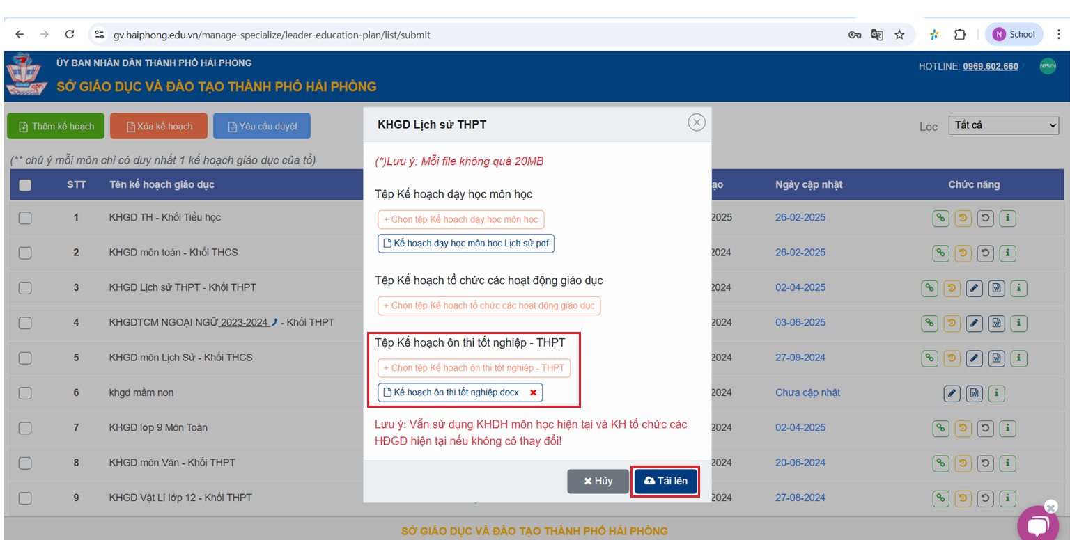 Thầy cô tải tệp lên tại mục “Chọn tệp kế hoạch ôn thi tốt nghiệp” và chọn “Tải lên”