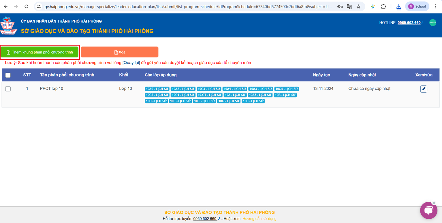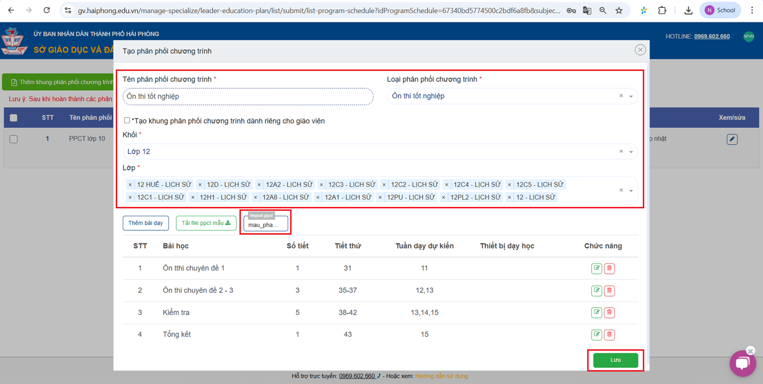 Lưu ý: Thầy cô không xóa Phân phối chương trình Chính khóa và Tự chọn mà chỉ thêm Phân phối chương trình Ôn thi tốt nghiệp.