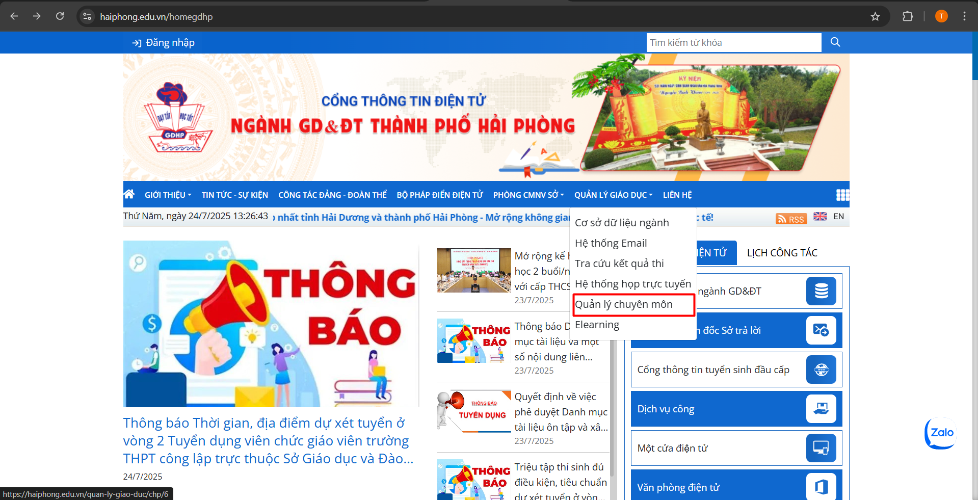 – Tại Cổng thông tin điện tử, Thầy/Cô chọn QUẢN LÝ GIÁO DỤC, chọn QUẢN LÝ CHUYÊN MÔN.