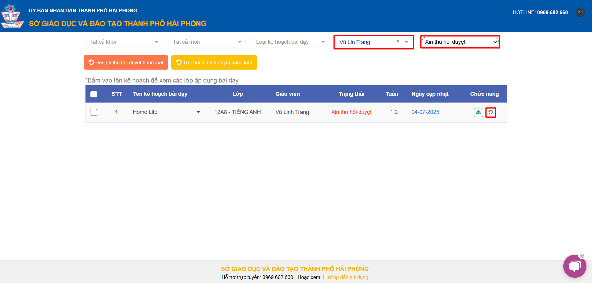 – Thầy/Cô lọc theo tên giáo viên, tìm trạng thái “Xin thu hồi duyệt”, thầy/cô chọn biểu tượng “Thu hồi duyệt“.
