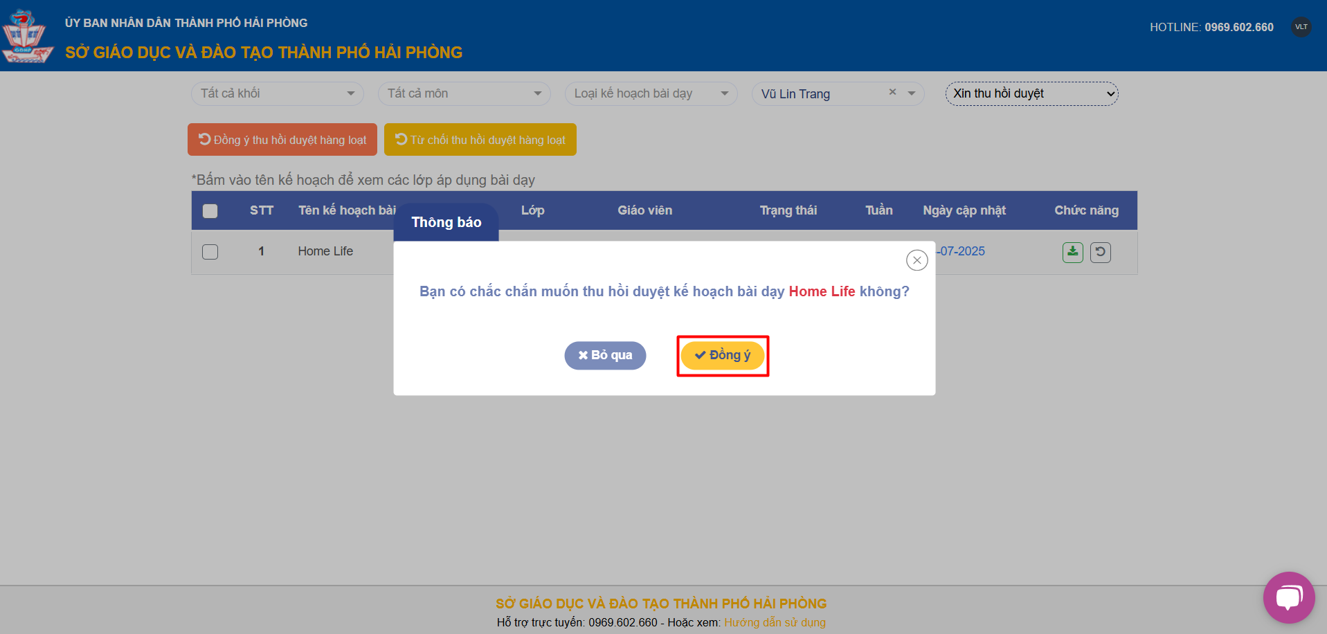Như vậy, Thầy/cô đã xác nhận thu hồi duyệt kế hoạch bài dạy cho giáo viên thành công!