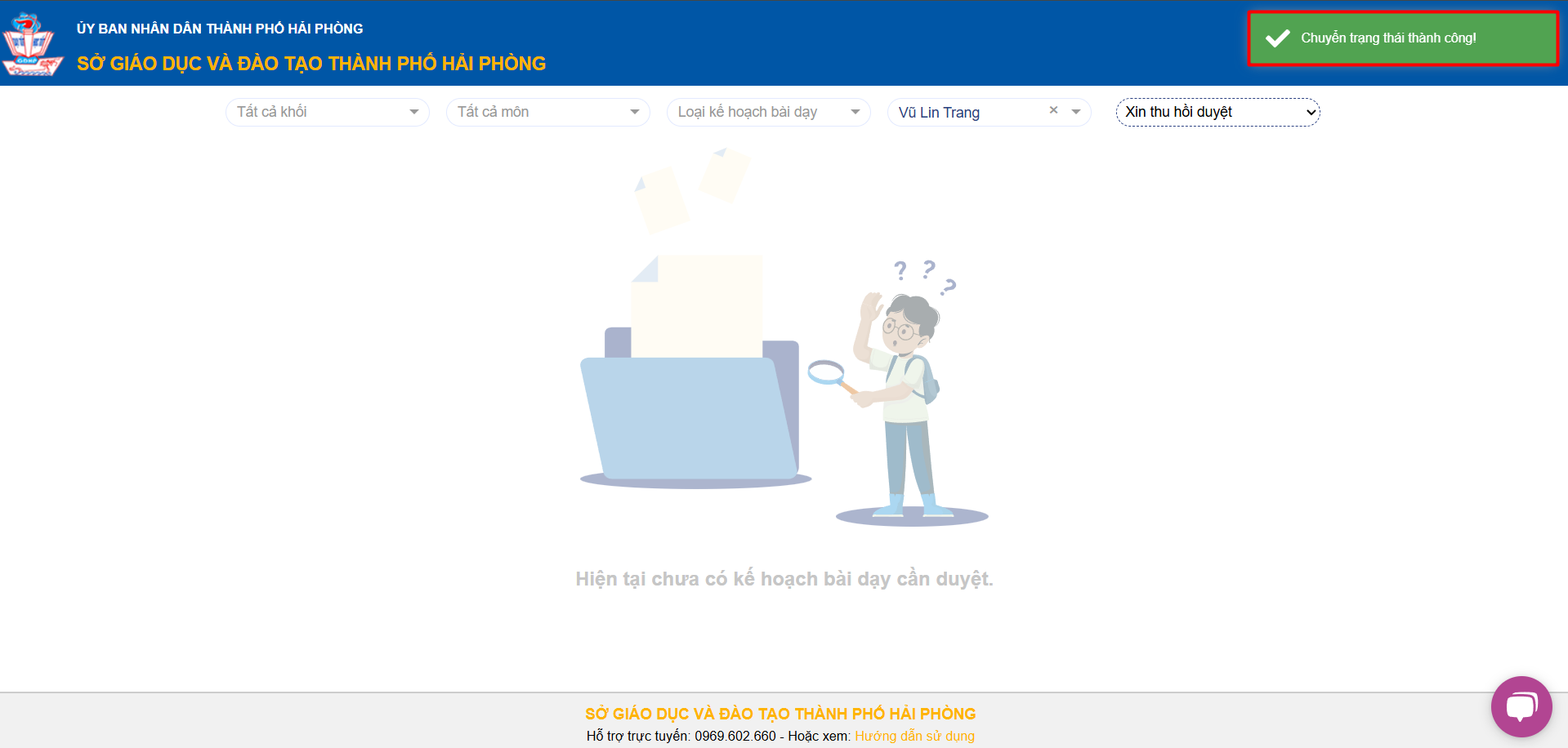 – Sau khi xác nhận thu hồi duyệt, hệ thống sẽ thông báo “Chuyển trạng thái thành công”