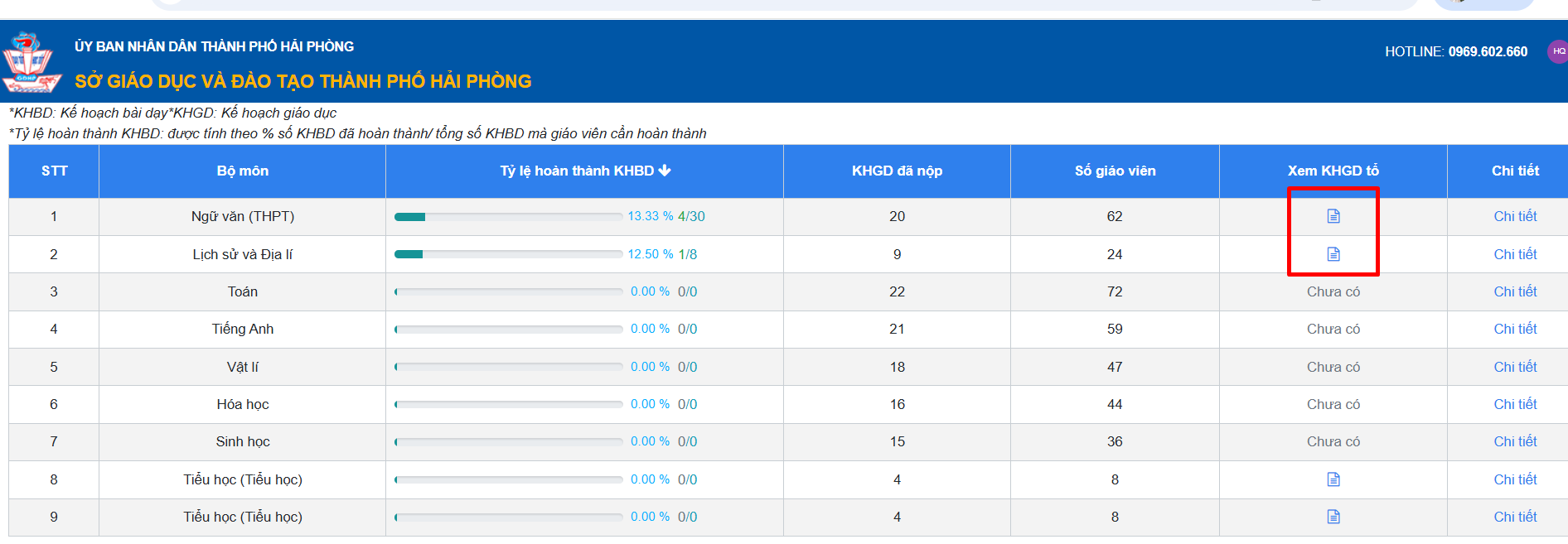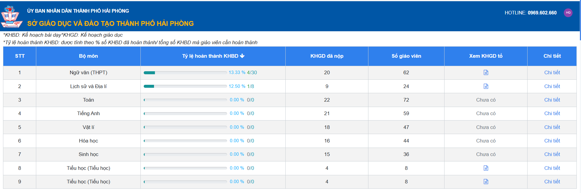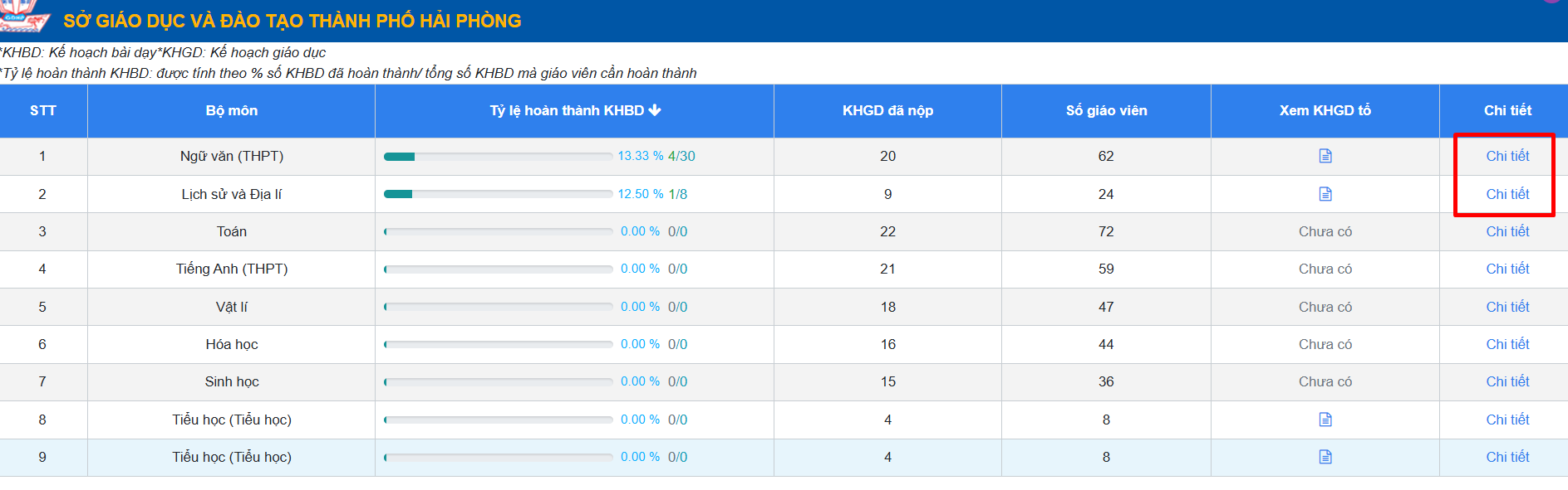 – Tại đây, thầy/cô có thể xem được bộ môn, KHGD đã nộp, số giáo viên bộ môn và tỷ lệ hoàn thành KHBD: được tính theo % số KHBD đã hoàn thành/ tổng số KHBD mà giáo viên cần hoàn thành