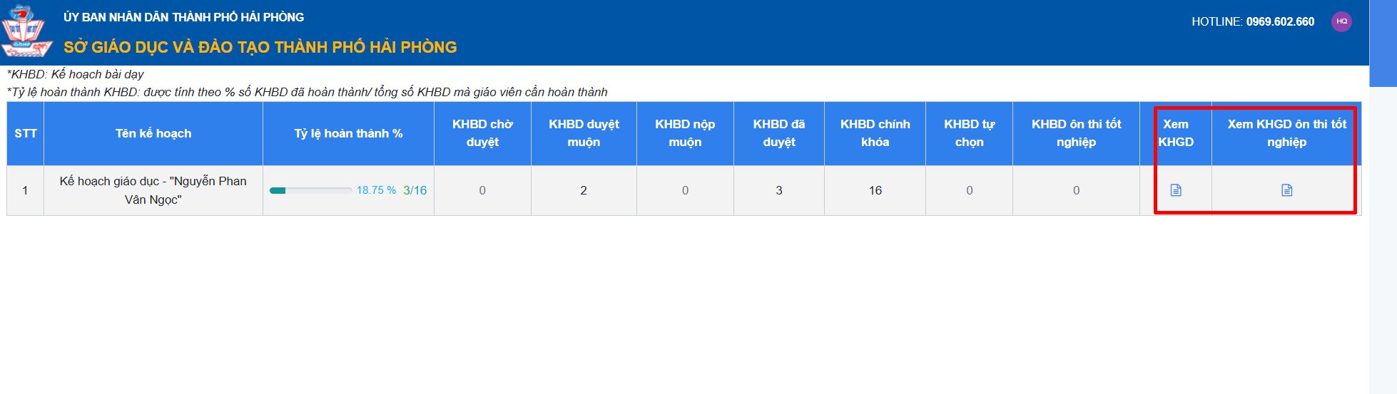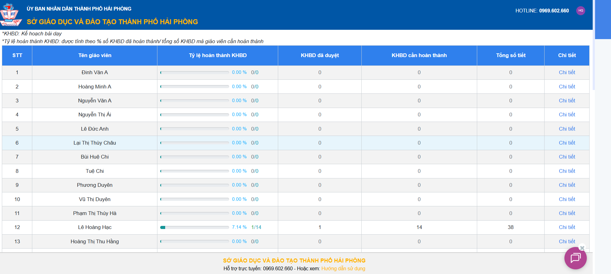 – Tại đây, thầy/cô có thể xem được tên giáo viên, KHBD đã duyệt, KHBD cần hoàn thành và tỷ lệ hoàn thành KHBD: được tính theo % số KHBD đã hoàn thành/ tổng số KHBD mà giáo viên cần hoàn thành.
